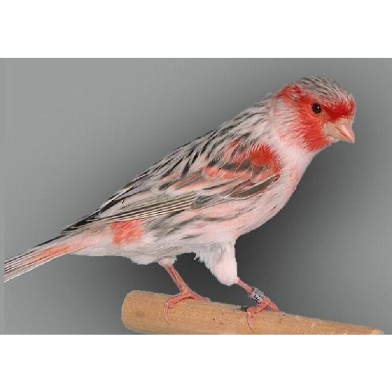 Φωτογραφία αρσενικού κόκκινου καναρινιού με πτέρωμα μωσαϊκού τύπου, που φέρει τη μετάλλαξη Τοπάζιο