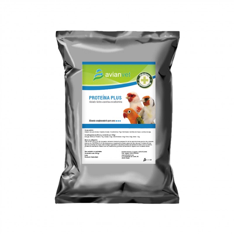 Το Avianvet Protein Plus είναι ένα συμπλήρωμα πρωτεΐνης για όλους τους τύπους πουλιών. Χωρίς καροτενοειδή. Το Protein Plus Avianvet περιέχει μικυλιακή καζεΐνη και αλβουμίνη, που είναι οι πρωτεΐνες με την υψηλότερη βιολογική αξία και την υψηλότερη πεπτικότητα για τα πουλιά. Το Protein Plus Avianvet περιέχει υψηλά επίπεδα βασικών και απαραίτητων αμινοξέων που μετατρέπονται σε μυϊκή πρωτεΐνη κατά τη διάρκεια των δραστηριοτήτων μεταβολικής ανάπτυξης των πτηνών. Αυξάνει τη γονιμότητα, βελτιώνει τους ρυθμούς ωοτοκίας και διεγείρει την ανάπτυξη κατά τους πρώτους μήνες της ζωής των πτηνών. Σύνθεση: Απομόνωση ορού γάλακτος, Μικυλιακή καζεΐνη, Αλβουμίνη.