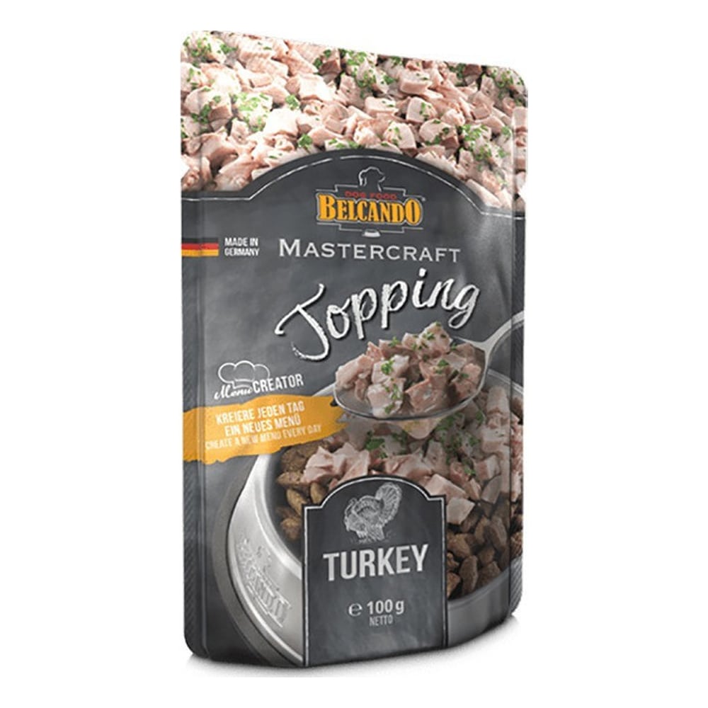 Γευστική επίστρωση σάλτσας με γαλοπούλα και μαϊντανό για το σκυλάκι σας, ανεξαρτήτως φυλής. Η γευστική αυτή επίστρωση σας επιτρέπει να προσθέσετε την τελική πινελιά στο μενού οποιασδήποτε ξηράς τροφής. Τα κυβάκια φρέσκου κρέατος μαγειρεύονται ήπια στους χυμούς τους και αναμειγνύονται με επίλεκτα λαχανικά. Έτσι η ενεργειακή τους πυκνότητα είναι χαμηλότερη από αυτήν της συμβατής υγρής τροφής. Προστίθεται συμπληρωματικά στην ξηρά τροφή και την μετατρέπει σε μια φρέσκια φυσική έκρηξη γεύσης για τον αγαπημένο σας φίλο.
