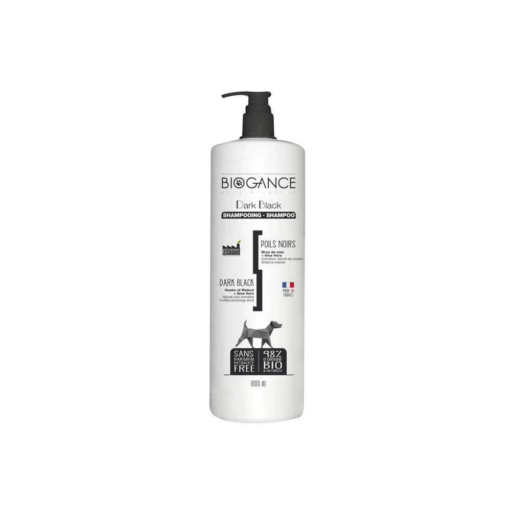 Το Biogance Dog Dark Black Shampoo είναι σαμπουάν για σκύλους με σκούρο ή μαύρο τρίχωμα που καθαρίζει απαλά και βοηθά να ενεργοποιηθεί και να ενισχυθεί το φυσικό χρώμα του τριχώματος με φυσικά εκχυλίσματα όπως φλοιό καρυδιού και αλόη. Η σύνθεση έχει ουδέτερο pH και δεν περιέχει parabens ή φθαλικές ενώσεις για ήπια φροντίδα των ινών του τριχώματος.