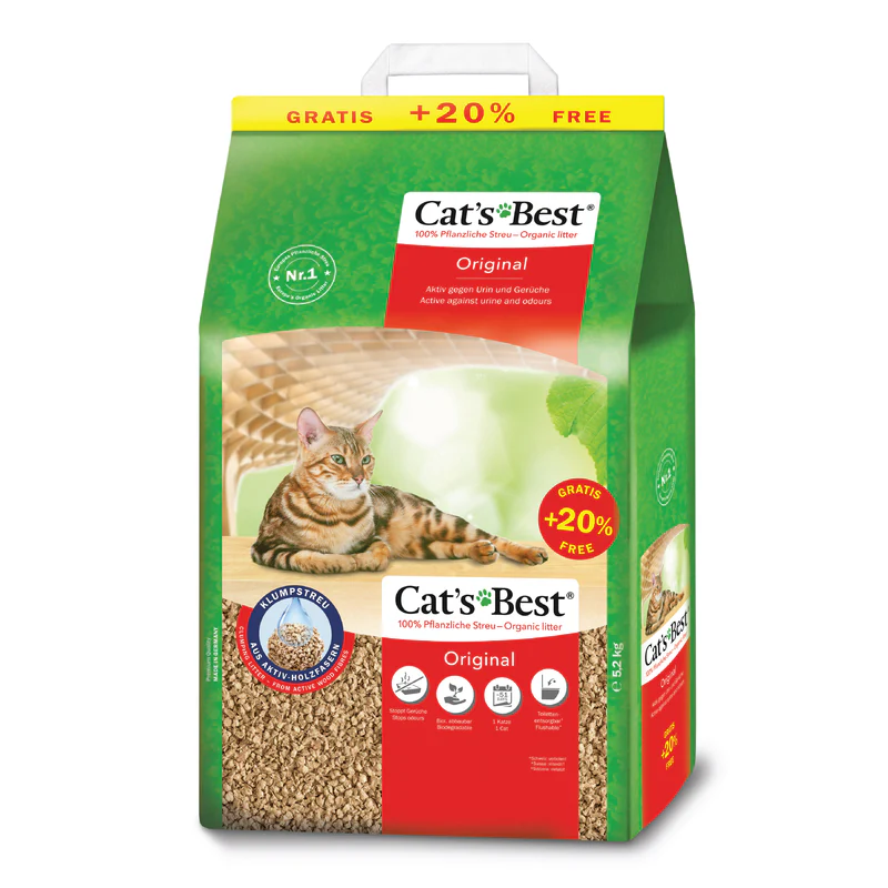 Δεν κόβονται δέντρα για το Cat’s Best, επειδή το Cat’s Best είναι κατασκευασμένο από βιώσιμες, πιστοποιημένες από PEFC δευτερεύουσες πρώτες ύλες ξύλου από τη βιομηχανία ξυλείας. Σε αντίθεση με τα ορυκτά απορρίμματα γάτας, το Cat’s Best χρησιμοποιεί μικρές διαδρομές μεταφοράς, είναι πολύ πιο οικονομικό στη χρήση και είναι πλήρως βιοδιασπώμενο.