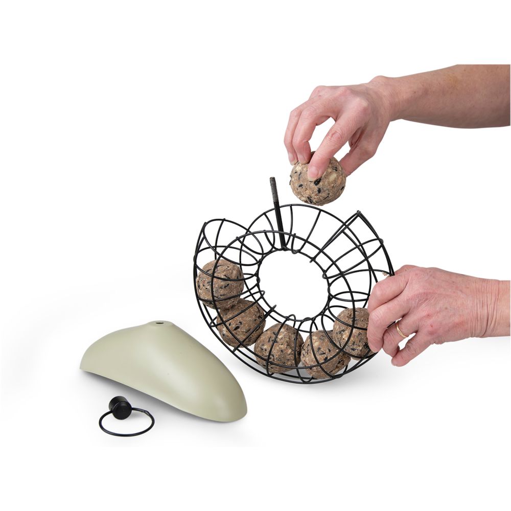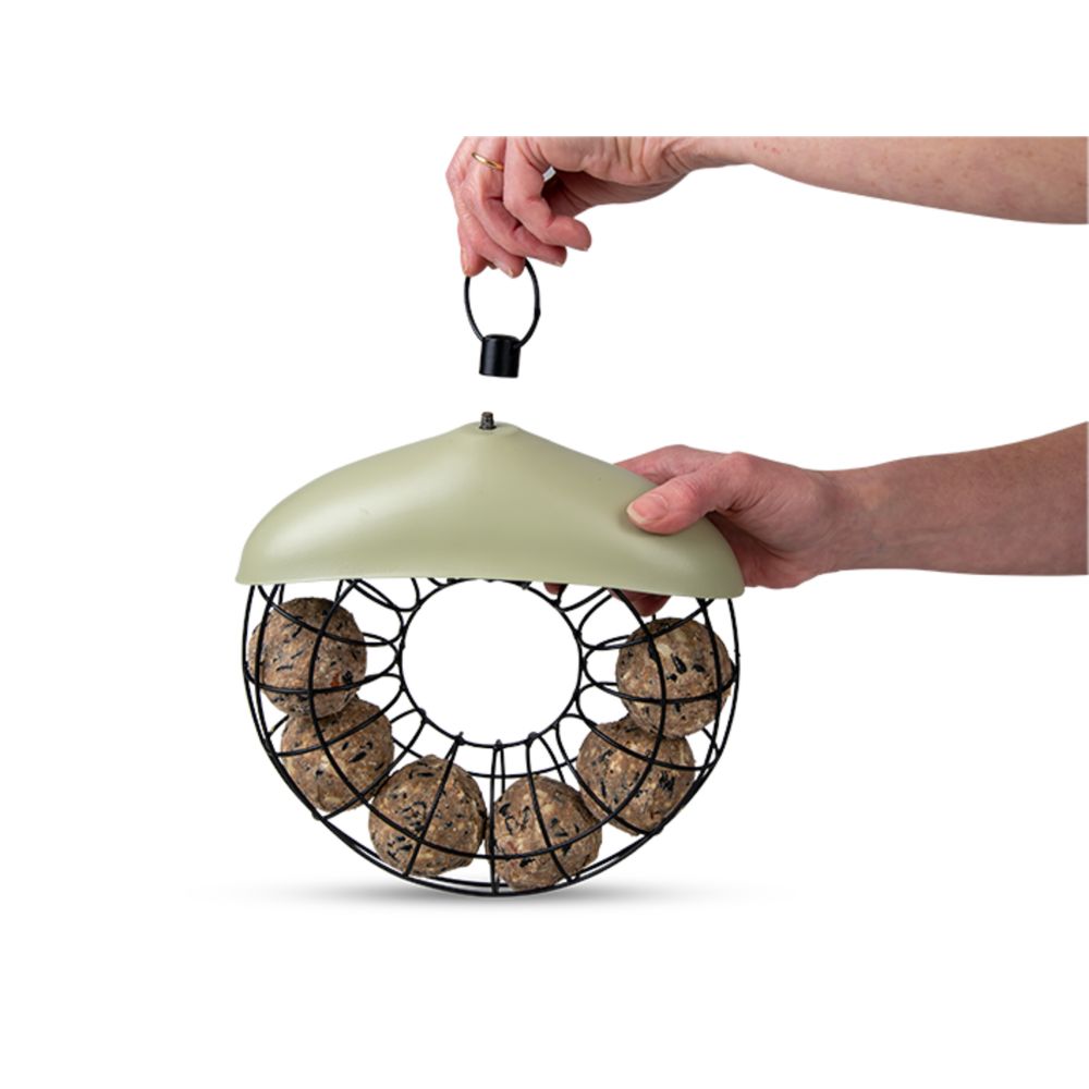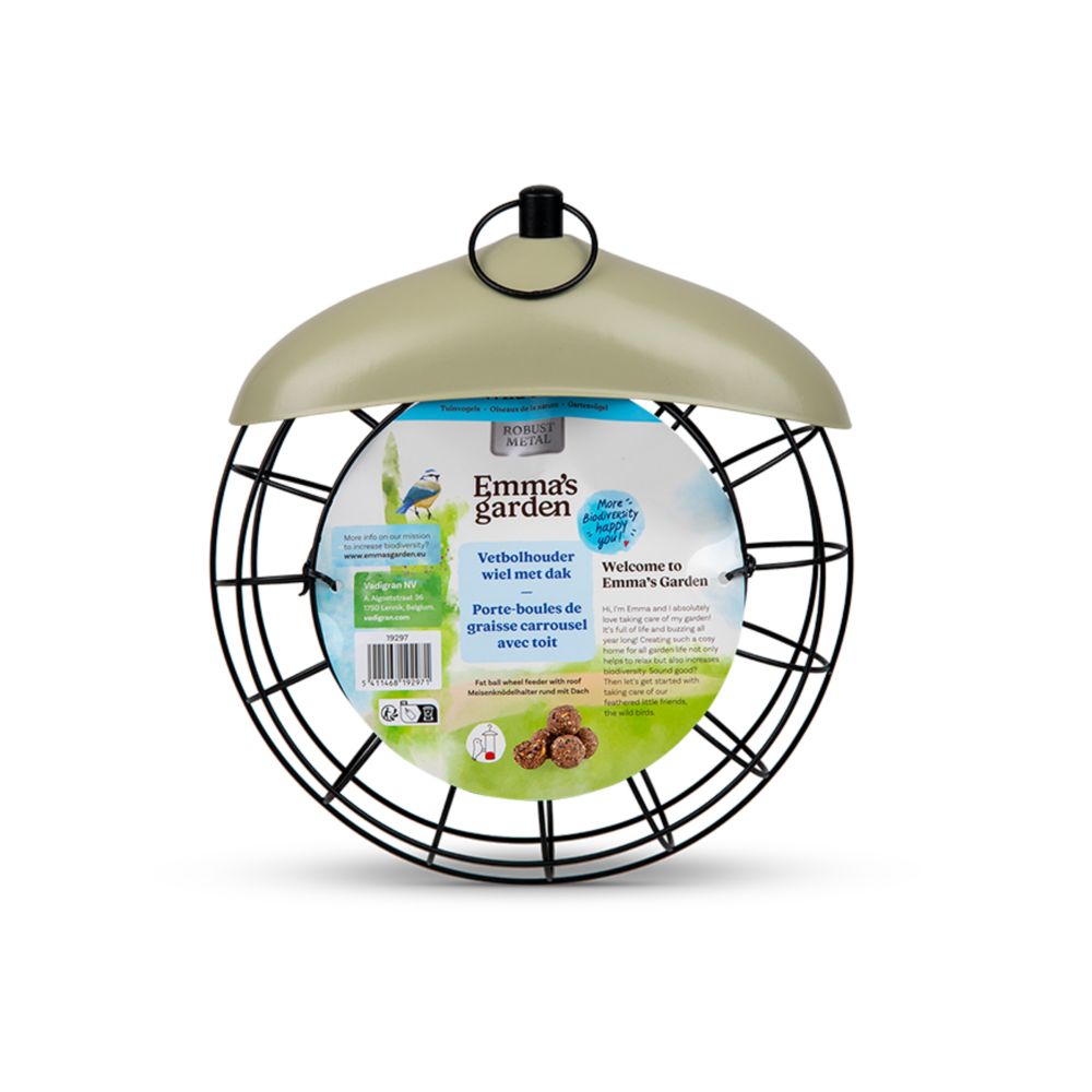 Τροφοδότης τύπου τροχός με στέγη μήκους 24 cm, σχεδιασμένος για σίτιση λιπαρών μπαλών (fat balls) σε κήπους και εξωτερικούς χώρους. Η πρακτική στέγη προστατεύει την τροφή από την υγρασία, ενώ ο περιστρεφόμενος σχεδιασμός διευκολύνει τα άγρια πτηνά να έχουν πρόσβαση στη τροφή τους με άνεση και ασφάλεια.