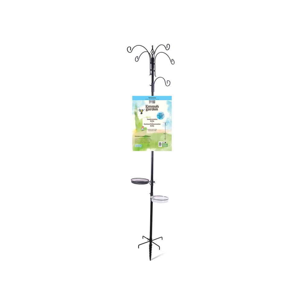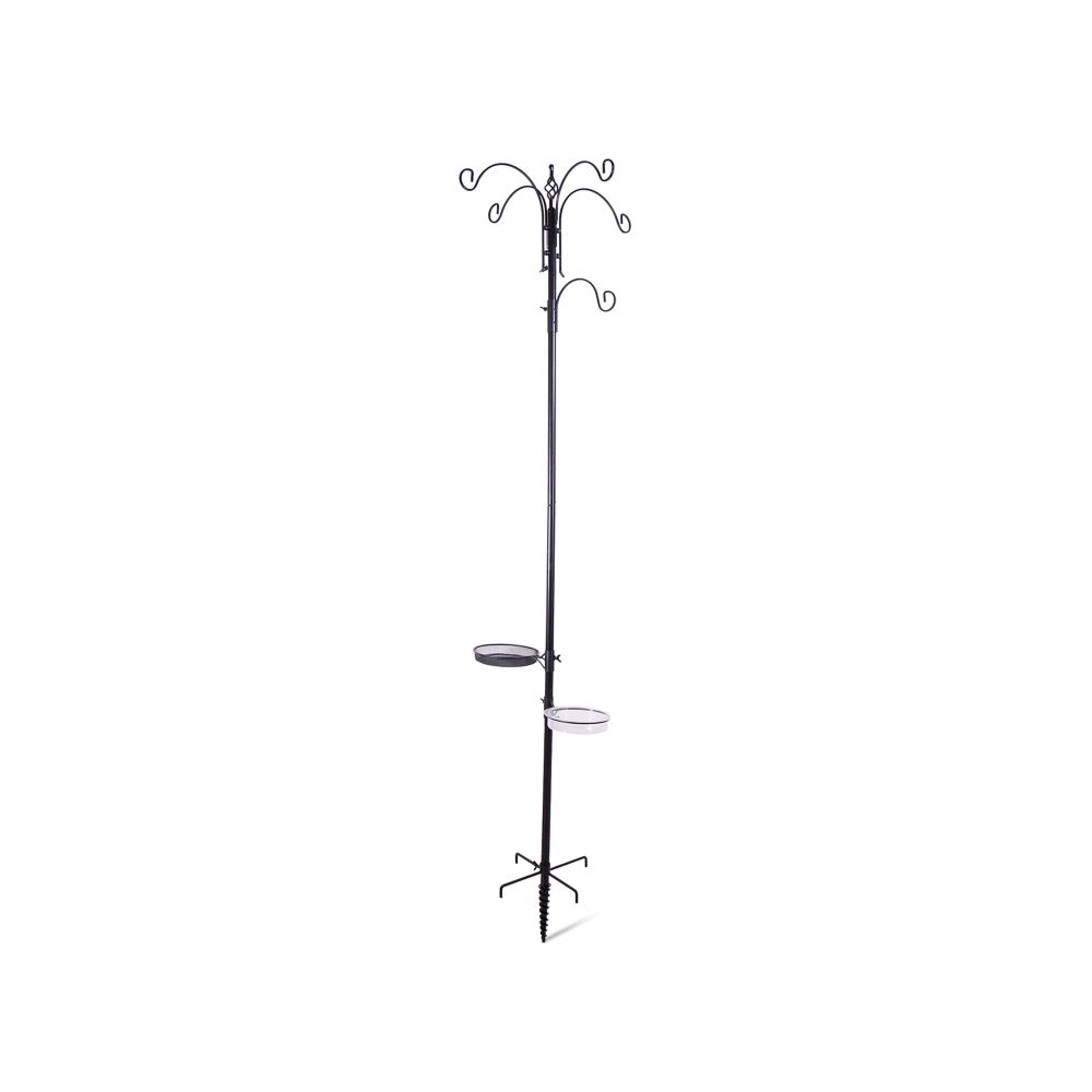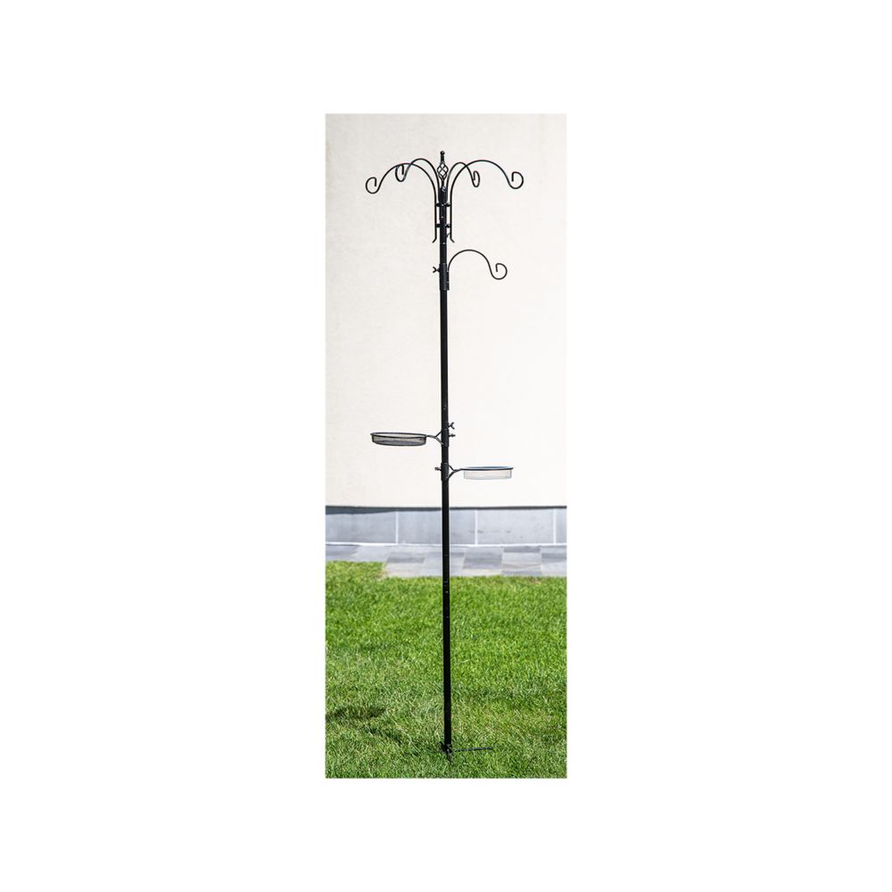 Σταθμός σίτισης για άγρια πτηνά με ανθεκτική μεταλλική κατασκευή σε μαύρο χρώμα, σχεδιασμένος για να προσφέρει ολοκληρωμένη λύση σίτισης με ενσωματωμένο δίσκο, πιατέλα νερού και πολλαπλές θέσεις για τροφοδότες, ιδανικός για κήπους ή υπαίθριους χώρους.