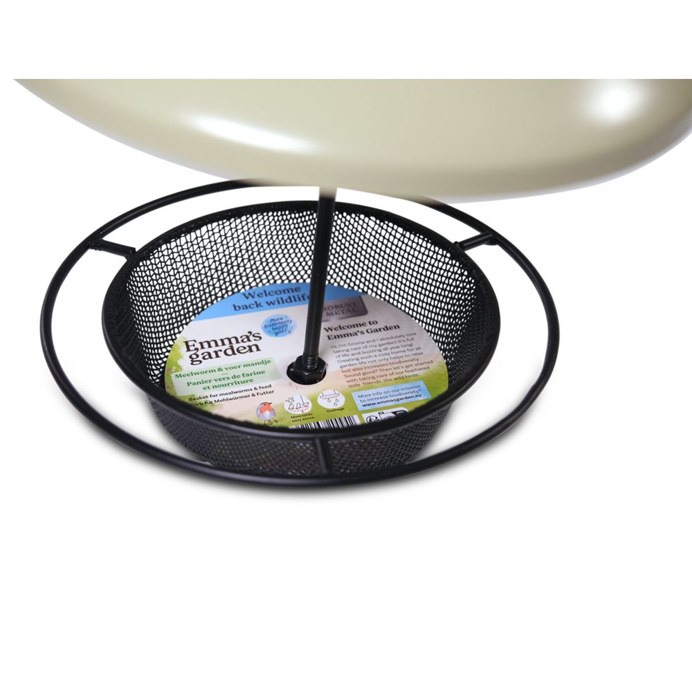 Κρεμαστό μεταλλικό καλάθι τροφοδότη με προστατευτική στέγη, σχεδιασμένο για την τοποθέτηση σκουλικιών γεύματος (mealworms) και άλλων τύπων τροφής για άγρια πτηνά σε κήπους και εξωτερικούς χώρους. Η στέγη προστατεύει την τροφή από βροχή και υγρασία, ενώ η μεταλλική κατασκευή προσφέρει ανθεκτικότητα και σταθερότητα στην καθημερινή χρήση.