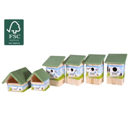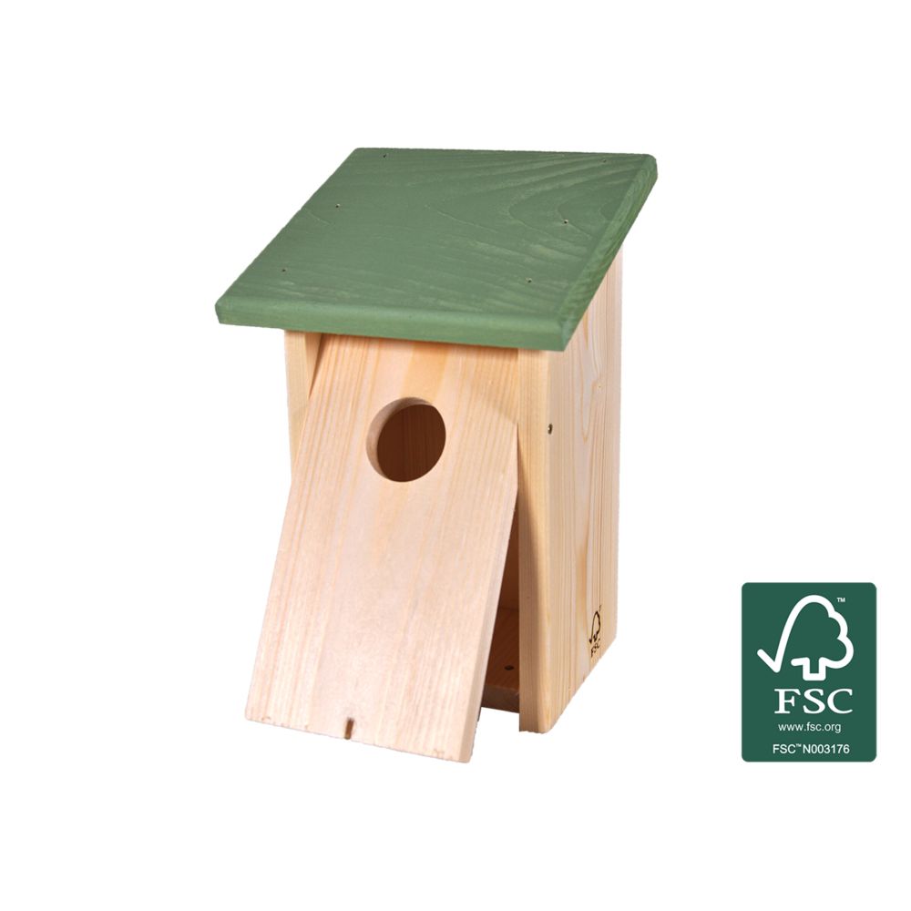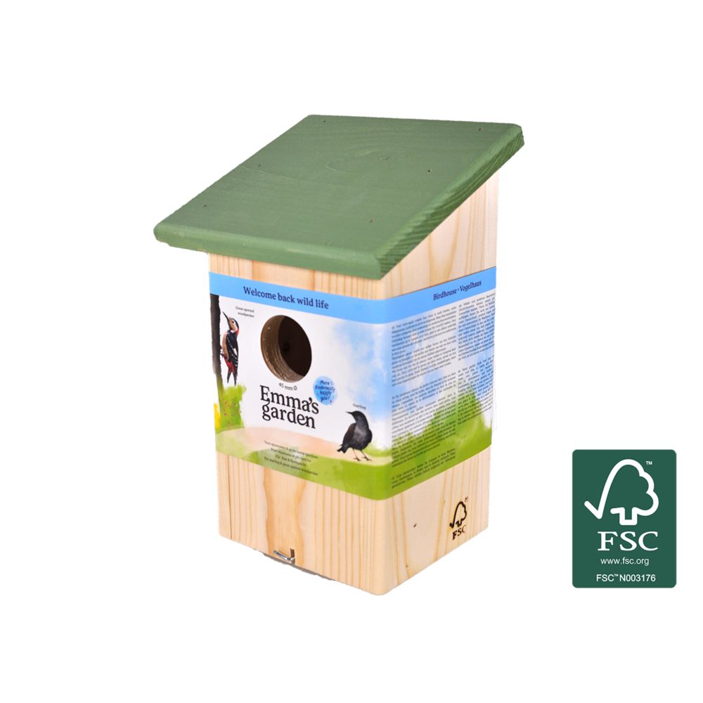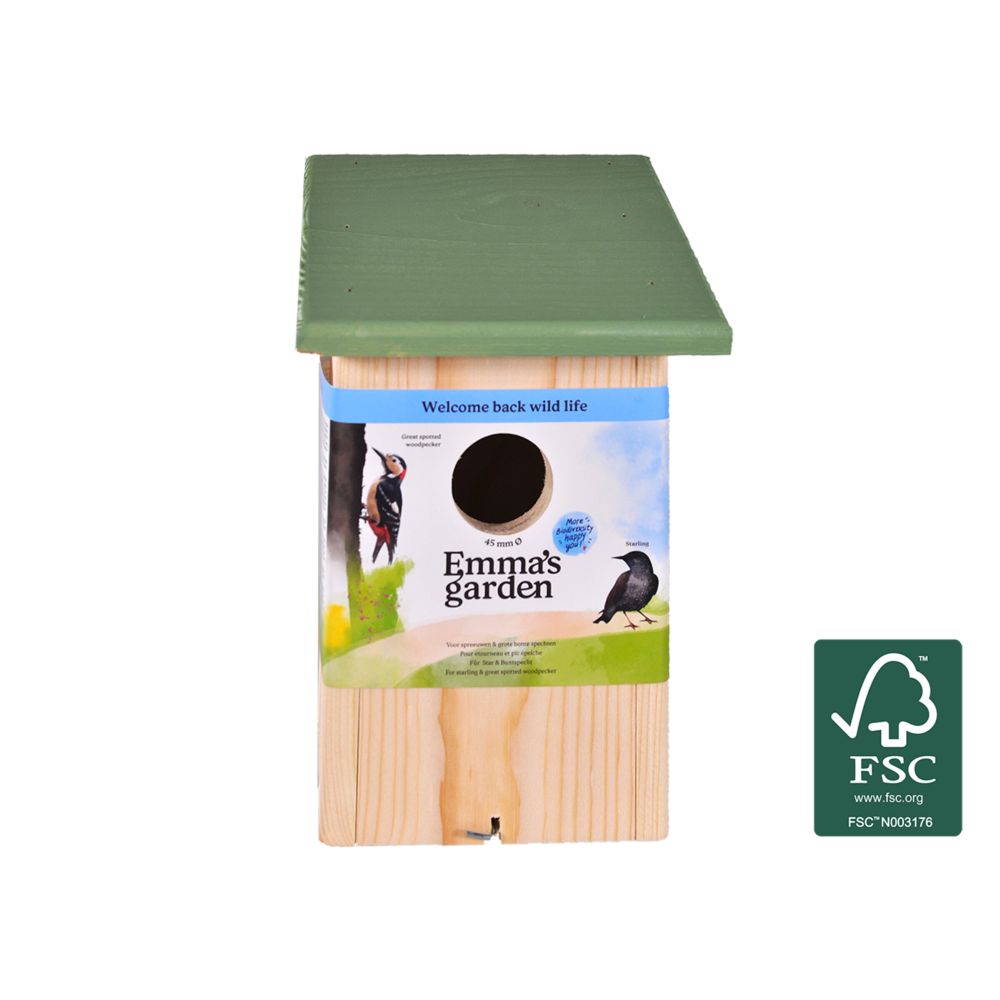 Ξύλινη φωλιά με άνοιγμα εισόδου 45mm, κατασκευασμένη από FSC πιστοποιημένο ξύλο για υπαίθρια χρήση και υποστήριξη φωλεοποίησης.