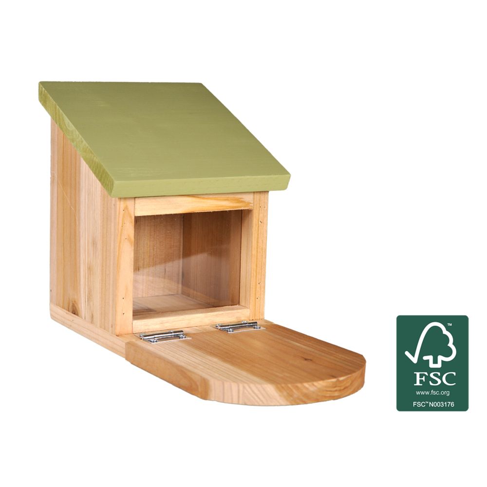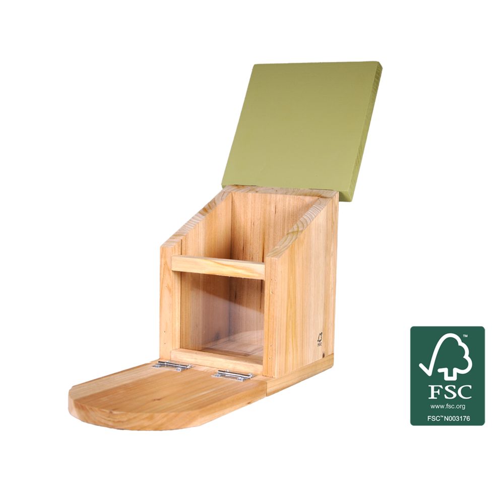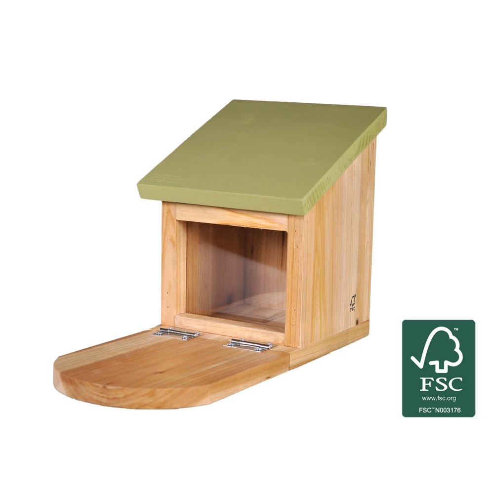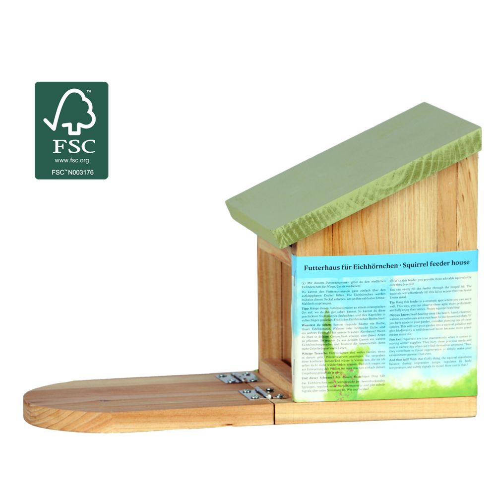 Ξύλινο σπιτάκι τροφοδοσίας για σκίουρους, κατασκευασμένο από FSC πιστοποιημένο ξύλο με πρακτικό άνοιγμα και ανθεκτικό σχεδιασμό για υπαίθρια χρήση, προσφέροντας ασφαλή θέση για τοποθέτηση τροφής σε κήπους και υπαίθριους χώρους.