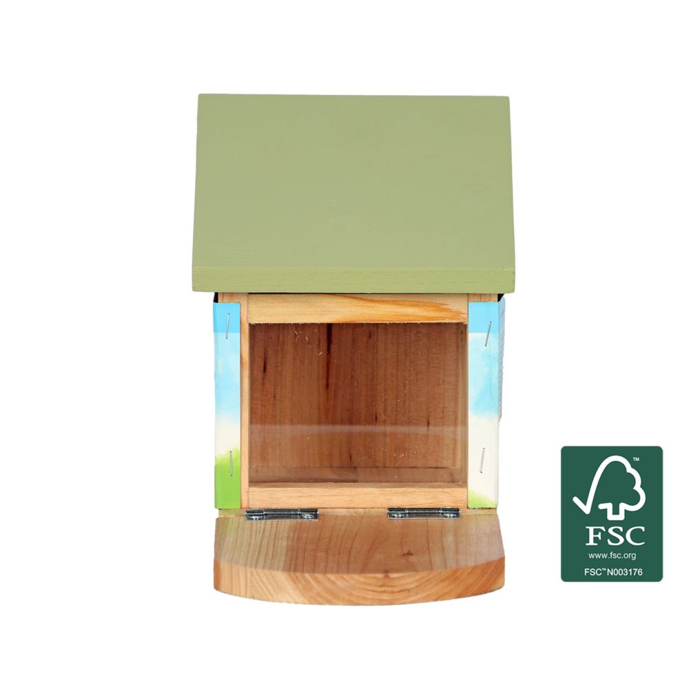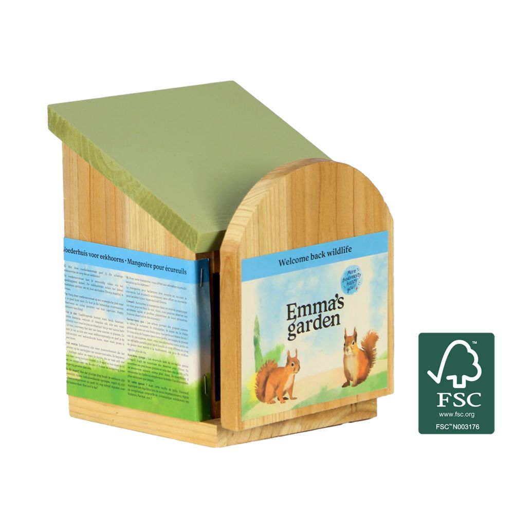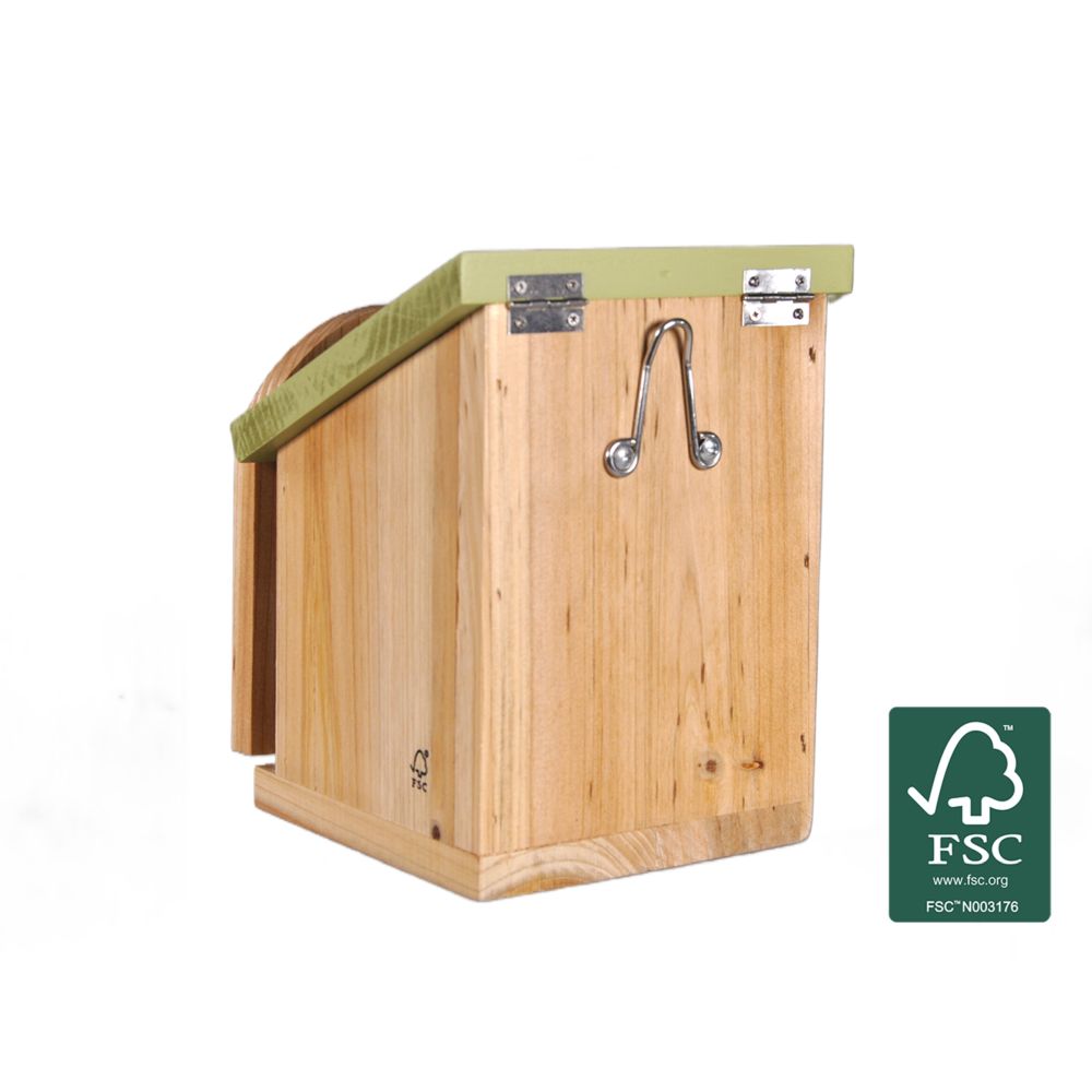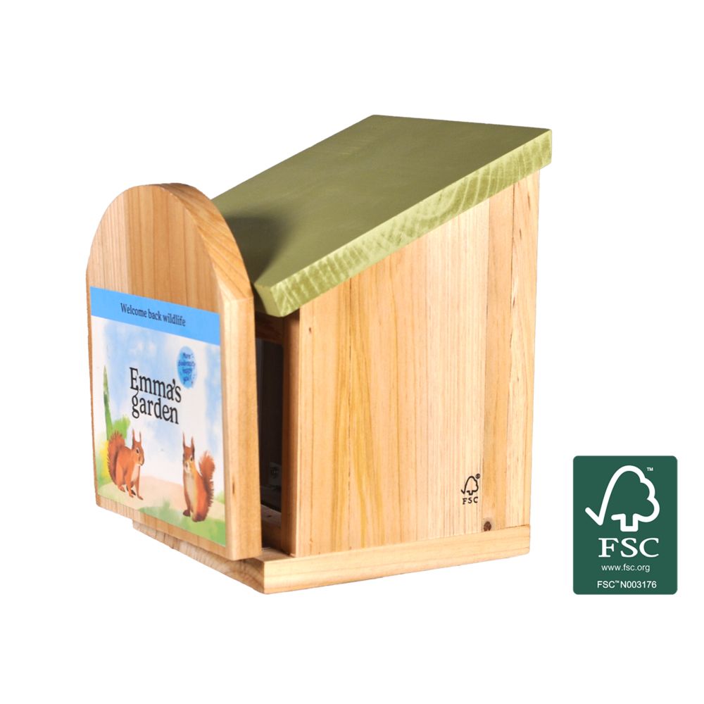 Ξύλινο σπιτάκι τροφοδοσίας για σκίουρους, κατασκευασμένο από FSC πιστοποιημένο ξύλο με πρακτικό άνοιγμα και ανθεκτικό σχεδιασμό για υπαίθρια χρήση, προσφέροντας ασφαλή θέση για τοποθέτηση τροφής σε κήπους και υπαίθριους χώρους.