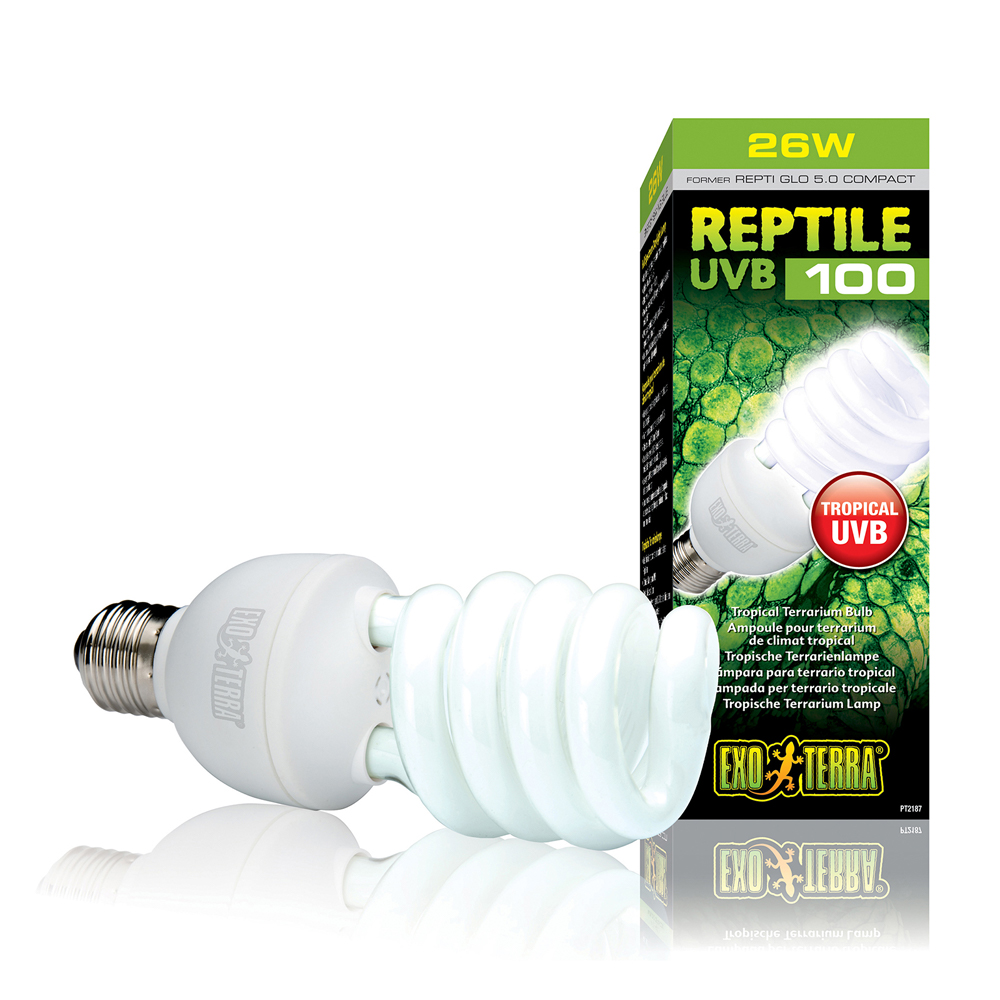 Το Exo Terra Reptile UVB100 εκπέμπει βέλτιστα επίπεδα UVB, παρόμοια με εκείνα των σκιερών περιβαλλόντων, όπως τα τροπικά δάση ή άλλες τροπικές τοποθεσίες. Τα ερπετά που ζουν σε αυτά τα ενδιαιτήματα δέχονται μέτρια υπεριώδη ακτινοβολία λόγω των κλιματολογικών συνθηκών (αρκετά υψηλή υγρασία, αλλαγές στον καιρό, κ.λπ.) που εμποδίζουν το αφιλτράριστο ηλιακό φως να φτάσει στη θέση του ερπετού. Ο βέλτιστος δείκτης απόδοσης βιταμίνης D3 διασφαλίζει τη φωτοσύνθεση της βιταμίνης D3 για να βοηθήσει την απορρόφηση του ασβεστίου και να αποτρέψει τις μεταβολικές ασθένειες.