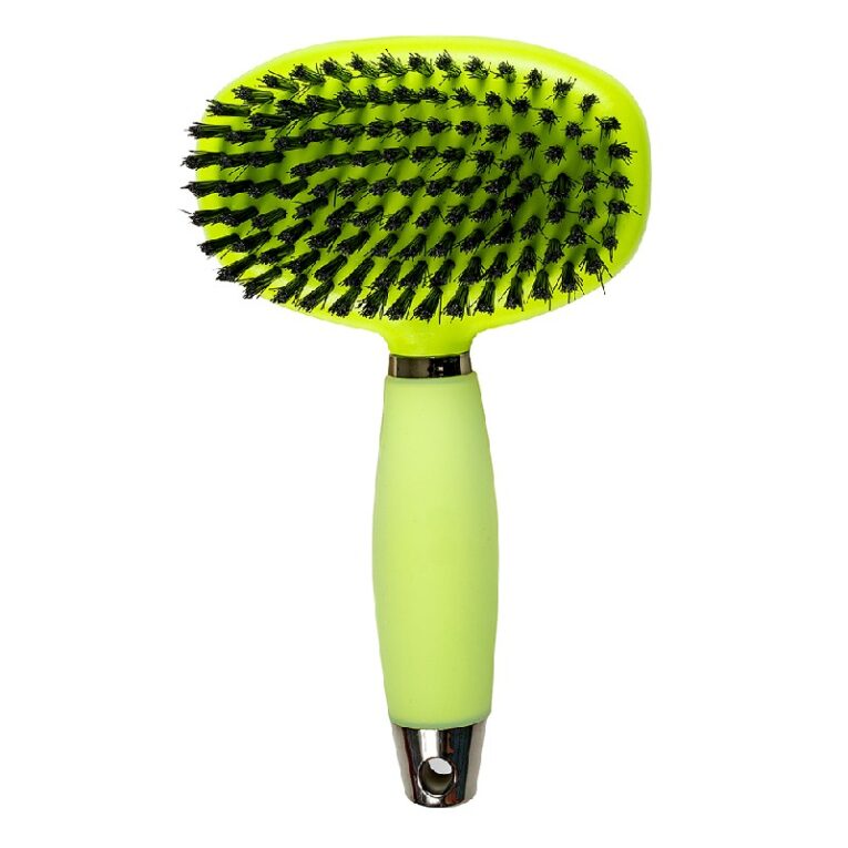 Βούρτσα οβάλ διπλής όψης, κατάλληλη για καθημερινή περιποίηση & όλους τους τύπους τριχώματος. Διαθέτει στη μία πλευρά μεταλλικές ακίδες για εύκολο ξεμπέρδεμα των κόμπων ενώ στην άλλη πλευρά οι μαλακές τρίχες αφαιρούν το νεκρό τρίχωμα και ταυτόχρονα διατηρούν τα φυσικά έλαια, μεταφέροντας τα σε όλο το μήκος της τρίχας, προσδίδοντας λάμψη και υγεία στο τρίχωμα του κατοικιδίου σας. Μεταλλικές ακίδες για εύκολο ξεμπέρδεμα των κόμπων. Με άνετη μαλακή λαβή.