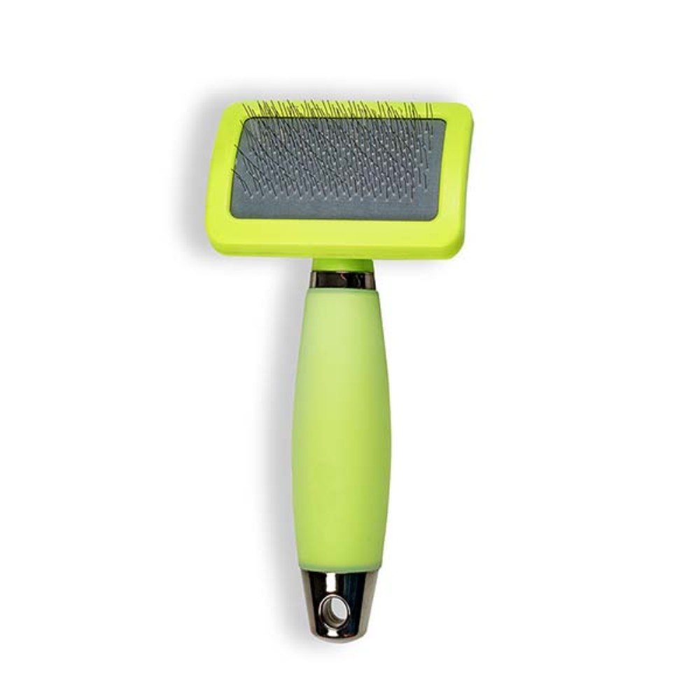 Βούρτσα Slicker περιποίησης κατοικιδίων. Μοντέρνα βούρτσα που χαρακτηρίζεται από την πρωτοποριακή χειρολαβή που ταιριάζει εργονομικά στην παλάμη του χεριού σας κατασκευασμένη από μαλακή, εύπλαστη σιλικόνη.