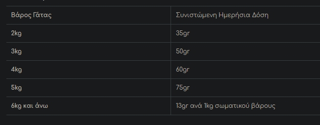 Κάθε γάτα είναι διαφορετική και η ποσότητα παρεχόμενης τροφής είναι πιθανό να αλλάζει με βάση την ηλικία και τον τρόπο ζωής της. Χρησιμοποιήστε την συνιστώμενη δόση σαν οδηγό, παρακολουθείστε το βάρος της και προσαρμόστε ανάλογα τις ποσότητες για τη μικρή μας φίλη. Ταΐστε την δύο φορές την ημέρα, έχοντας πάντα δίπλα της φρέσκο, καθαρό νερό!
