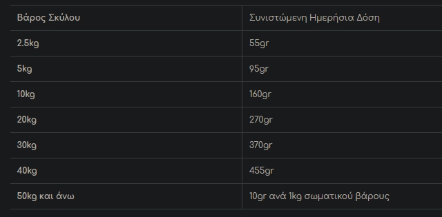 Κάθε σκύλος είναι διαφορετικός και η ποσότητα παρεχόμενης τροφής είναι πιθανό να αλλάζει με βάση την ηλικία και τον τρόπο ζωής του. Χρησιμοποιήστε την συνιστώμενη δόση σαν οδηγό, παρακολουθείστε το βάρος του και προσαρμόστε ανάλογα τις ποσότητες για τον μικρό μας φίλο. Ταΐστε τον δύο φορές την ημέρα, έχοντας πάντα δίπλα του φρέσκο, καθαρό νερό!