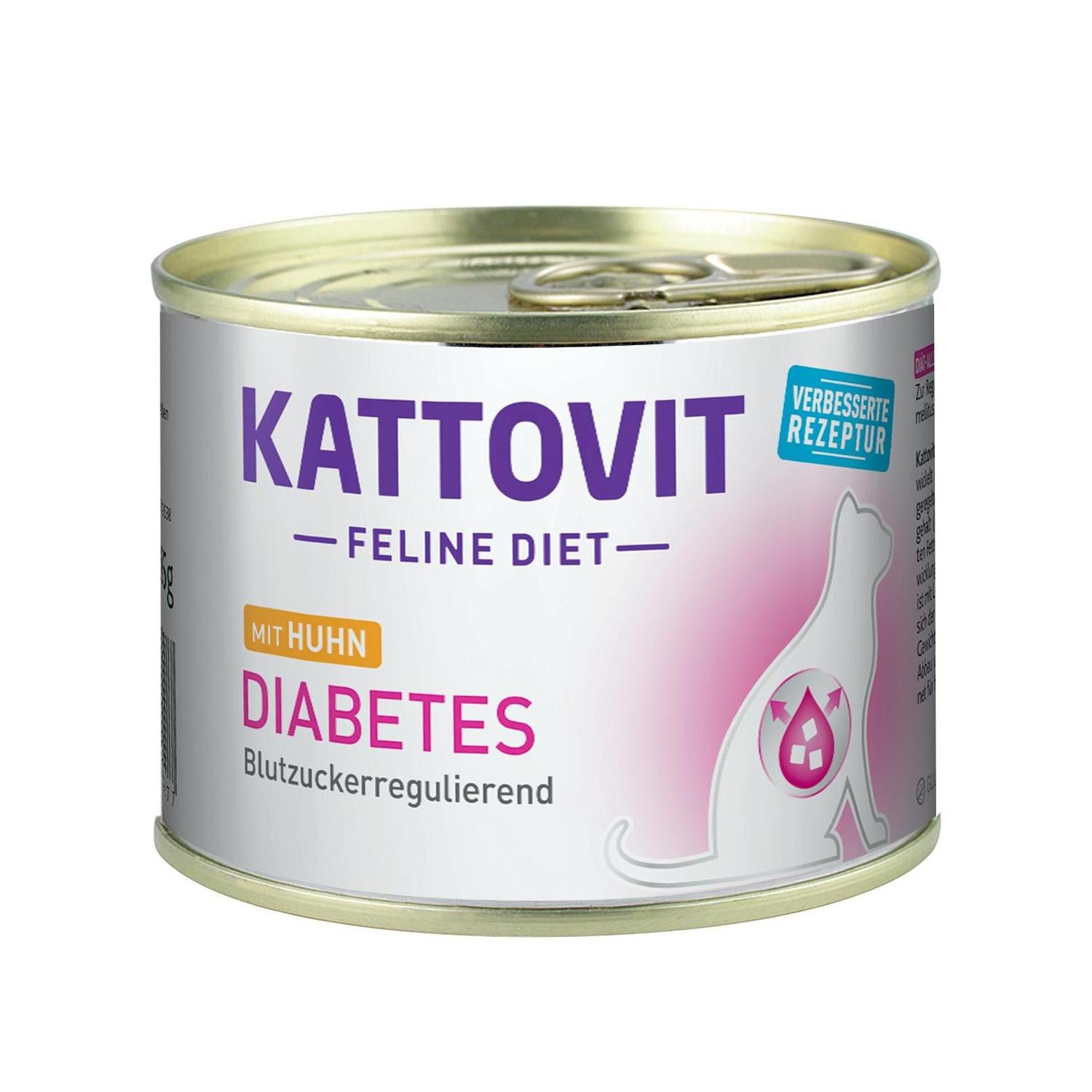 Για τη ρύθμιση της παροχής γλυκόζης (σακχαρώδης διαβήτης) και τη μείωση της παχυσαρκίας. Η Kattovit Diabetes Chicken αναπτύχθηκε ειδικά με υδατάνθρακες μακράς αλυσίδας για τη ρυθμιζόμενη απελευθέρωση της γλυκόζης. Έχει χαμηλή περιεκτικότητα σε μονοσακχαρίτες και δισακχαρίτες ενώ, η υψηλή περιεκτικότητα της σε ακατέργαστες ίνες (χονδροειδείς ίνες) σε συνδυασμό με τα μειωμένα επίπεδα λίπους έχει εξισορροπητική επίδραση στην ανάπτυξη των επιπέδων σακχάρου στο αίμα. Επιπλέον, είναι εμπλουτισμένη με L-καρνιτίνη για την υποστήριξη της διάσπασης των αποθεμάτων λίπους και την διατήρηση της μυϊκής μάζας. Δεν είναι κατάλληλη για έφηβες και έγκυες γάτες.