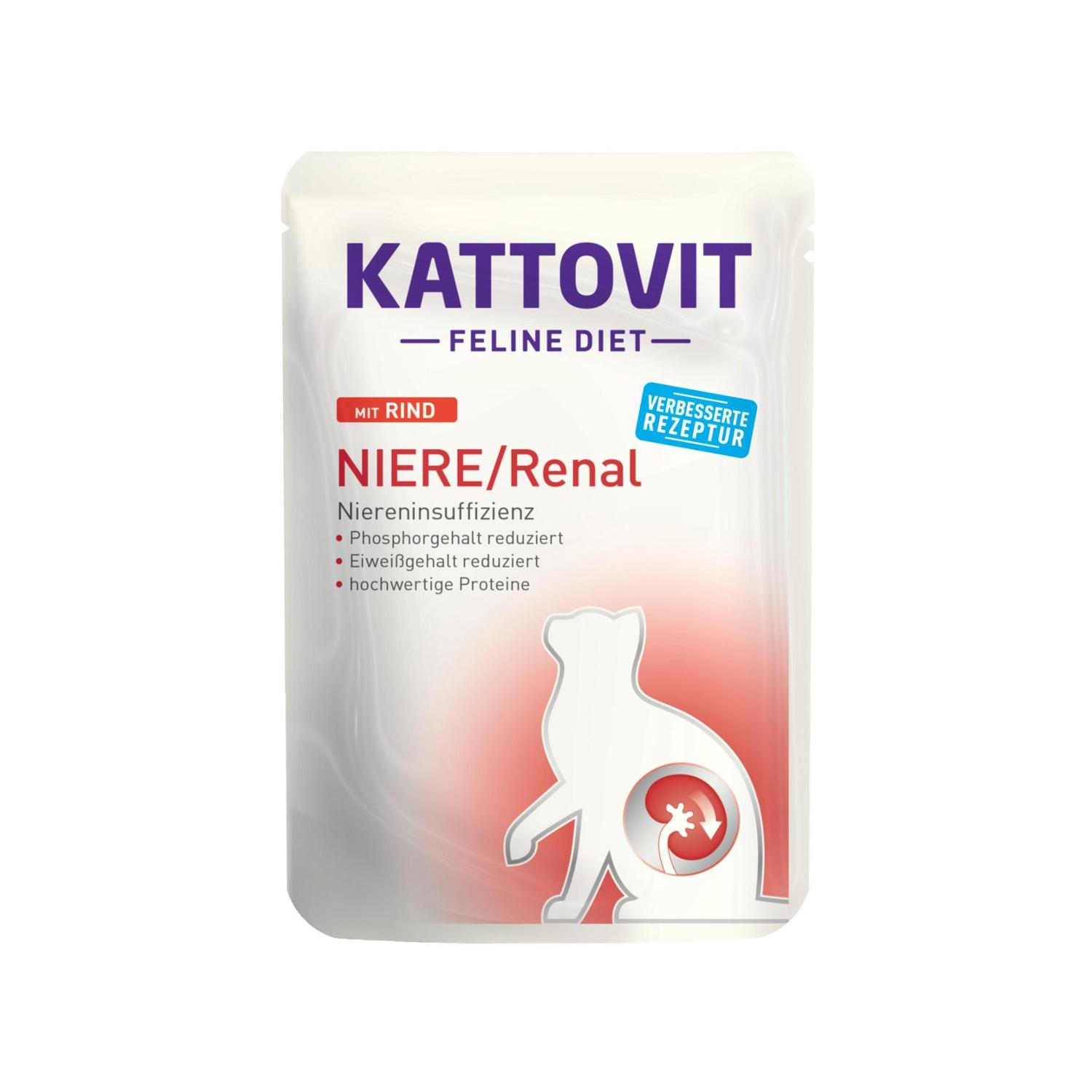 Για την υποστήριξη της νεφρικής λειτουργίας σε χρόνια νεφρική ανεπάρκεια και τη μείωση του σχηματισμού λίθων οξαλικού ασβεστίου. Η Kattovit Renal είναι μια εύπεπτη τροφή με μειωμένη περιεκτικότητα σε, υψηλής ποιότητας, πρωτεΐνες και χαμηλά επίπεδα σε νάτριο και φώσφορο. Σε αντίθεση με τις συμβατικές τροφές, μόνο περίπου η μισή ενέργεια προέρχεται από την πρωτεΐνη. Επιπλέον, είναι εμπλουτισμένη με κιτρικό κάλιο το οποίο έχει αλκαλοποιητική δράση στα ούρα και μπορεί να αποτρέψει τον σχηματισμό κρυστάλλων οξαλικού ασβεστίου.