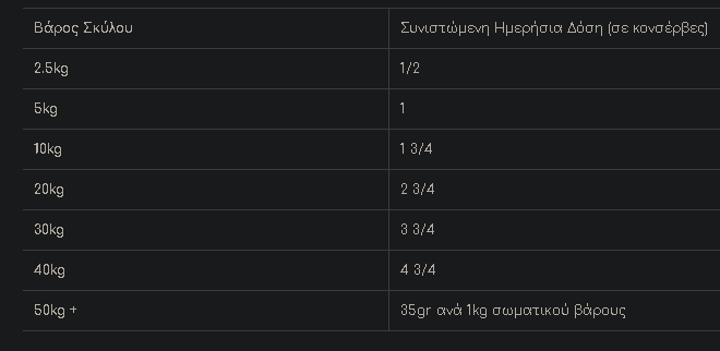Κάθε σκύλος είναι διαφορετικός και η ποσότητα παρεχόμενης τροφής είναι πιθανό να αλλάζει με βάση την ηλικία και τον τρόπο ζωής του. Χρησιμοποιήστε την συνιστώμενη δόση σαν οδηγό, παρακολουθείστε το βάρος του και προσαρμόστε ανάλογα τις ποσότητες για τον μικρό μας φίλο. Ταΐστε τον δύο φορές την ημέρα, έχοντας πάντα δίπλα του φρέσκο, καθαρό νερό!