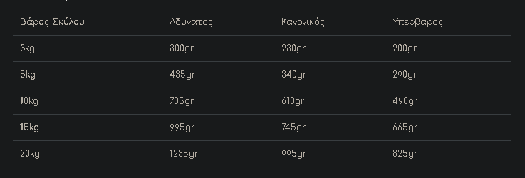 Οι ποσότητες μπορούν να προσαρμοστούν ανάλογα με το μέγεθος, τη φυσική δραστηριότητα και τις συνθήκες διαβίωσης του ζώου.Η συνιστώμενη ημερήσια μερίδα που αναφέρεται στον πίνακα μπορεί να διαιρεθεί σε δύο γεύματα. Φροντίστε να είναι πάντα διαθέσιμο φρέσκο, καθαρό νερό.Όταν αυτό το προϊόν αντικαθιστά έναν άλλο τύπο τροφής ή/και δίαιτας, συνιστάται η εισαγωγή του σταδιακά σε διάστημα τουλάχιστον 1 εβδομάδας.