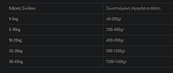 Κάθε σκύλος είναι διαφορετικός και η ποσότητα παρεχόμενης τροφής είναι πιθανό να αλλάζει με βάση την ηλικία και τον τρόπο ζωής του. Χρησιμοποιήστε την συνιστώμενη δόση σαν οδηγό, παρακολουθείστε το βάρος του και προσαρμόστε ανάλογα τις ποσότητες για τον μικρό μας φίλο. Ταΐστε τον δύο φορές την ημέρα, έχοντας πάντα δίπλα του φρέσκο, καθαρό νερό!