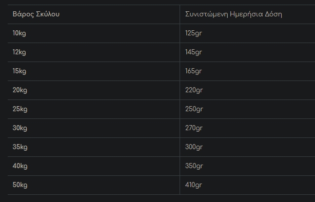Κάθε σκύλος είναι διαφορετικός και η ποσότητα παρεχόμενης τροφής είναι πιθανό να αλλάζει με βάση την ηλικία και τον τρόπο ζωής του. Χρησιμοποιήστε την συνιστώμενη δόση σαν οδηγό, παρακολουθείστε το βάρος του και προσαρμόστε ανάλογα τις ποσότητες για τον μικρό μας φίλο. Ταΐστε τον δύο φορές την ημέρα, έχοντας πάντα δίπλα του φρέσκο, καθαρό νερό!