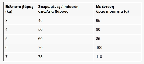 Κάθε γάτα είναι διαφορετική και η ποσότητα παρεχόμενης τροφής είναι πιθανό να αλλάζει με βάση την ηλικία και τον τρόπο ζωής της. Χρησιμοποιήστε την συνιστώμενη δόση σαν οδηγό, παρακολουθείστε το βάρος της και προσαρμόστε ανάλογα τις ποσότητες για τη μικρή μας φίλη. Ταΐστε την δύο φορές την ημέρα, έχοντας πάντα δίπλα της φρέσκο, καθαρό νερό!