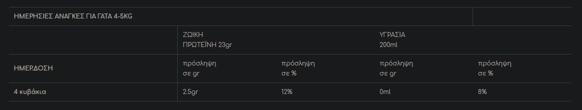 Συνιστώμενη ημερήσια δοσολογία: 1-2 τεμάχια ανά 2.5kg κιλά γάτας.Πρωτεΐνες: 78%  Oλ.λιπ.ουσ.: 2%Ολ.ινώδ.ουσ.:0.2%  Ολ.τέφρα: 3.5%Yγρασία: 7%Βάρος: 24γρ.