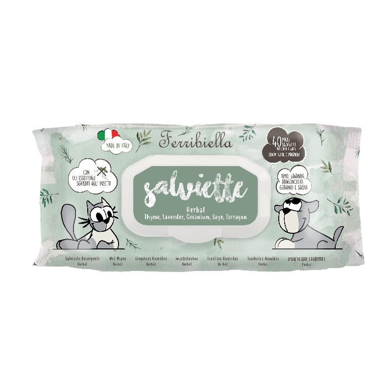 Υγρά μαντηλάκια κατοικιδίων από τη Ferribiella:Χωρίς αλκοόλ.Με άρωμα βοτάνων.Kατάλληλα για την καθαριότητα & υγιεινή των αυτιών, των ποδιών & της μουσούδας.Σε πλαστική συσκευασία με καπάκι για να διατηρούνται τα μαντηλάκια στην αρχική τους κατάσταση.Κατασκευασμένα στην Ιταλία