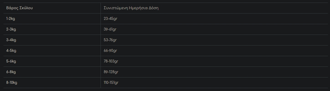 Κάθε σκύλος είναι διαφορετικός και η ποσότητα παρεχόμενης τροφής είναι πιθανό να αλλάζει με βάση την ηλικία και τον τρόπο ζωής του. Χρησιμοποιήστε την συνιστώμενη δόση σαν οδηγό, παρακολουθείστε το βάρος του και προσαρμόστε ανάλογα τις ποσότητες για τον μικρό μας φίλο. Ταΐστε τον δύο φορές την ημέρα, έχοντας πάντα δίπλα του φρέσκο, καθαρό νερό!