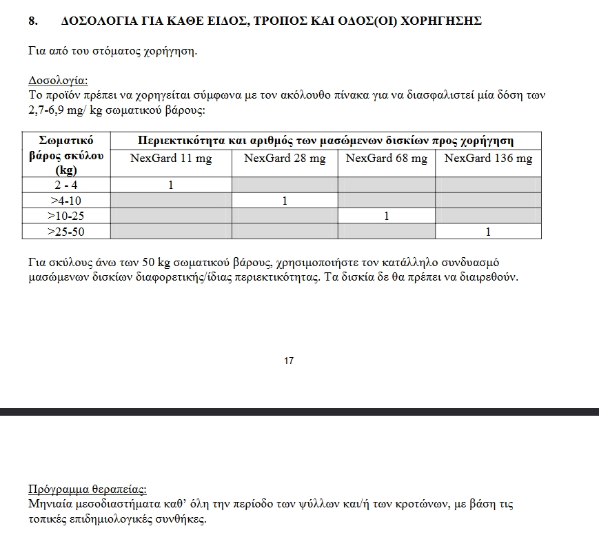 • Χορηγείται από το στόμα σε μηνιαία διαστήματα για να παρέχεται η συνιστώμενη δόση των 2,5 mg/kg Afoxolaner ανά kg σωματικού βάρους.