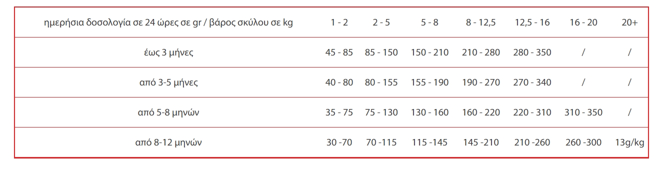 - Συνίσταται για κουτάβια μικρών και μεσαίων φυλών, για κουτάβια μεγάλων φυλών που έχουν μείνει πίσω στην ανάπτυξη και για υπερδραστήριους ενήλικες σκύλους μικρόσωμων φυλών που έχουν ανάγκη από ενέργεια με καλά ισορροπημένα λιπαρά οξέα.