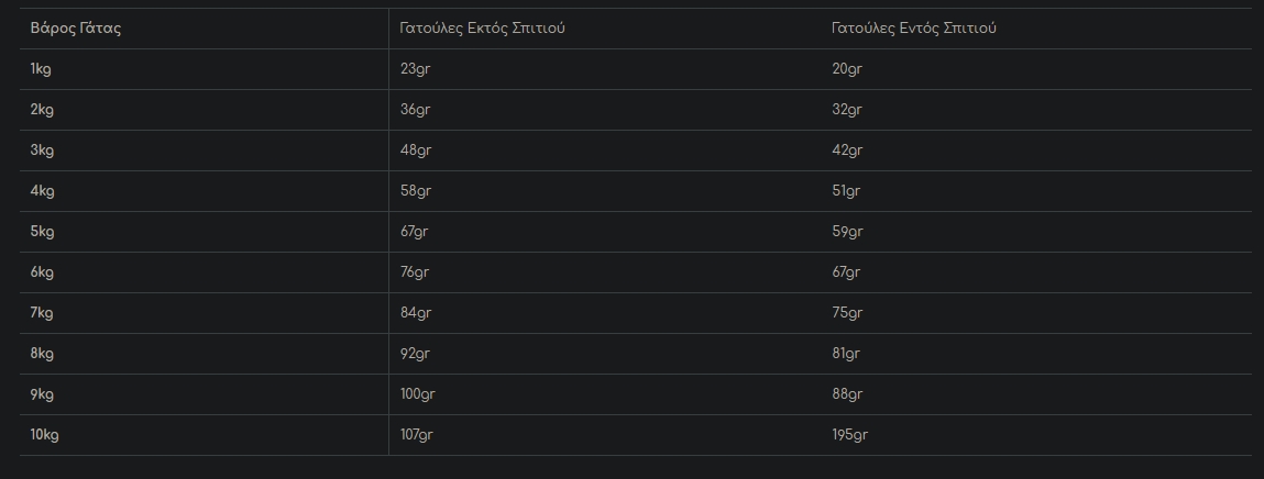 Ανάλυση: Ακατέργαστη πρωτεΐνη 32,00% Ακατέργαστη λιπαρά 14.00% Υγρασία 10.00% Ακατέργαστη τέφρα 7,00% Ακατέργαστες ίνες 3.00% Ωμέγα 6 3.60% ωμέγα 3 0,65% Βιταμίνη Α – Ε672 20.000 IU / kg Βιταμίνη D3 – E671 1.500 IU / kg Βιταμίνη Ε – 3α700 100,00 mg / kg Χαλκός 10 mg / kg Ψευδάργυρος (ως οξείδιο ψευδαργύρου) 30 mg / kg Ψευδάργυρος (ως χηλικός ψευδάργυρος ενυδατωμένων αμινοξέων) 40 mg / kg Ιώδιο 2 mg / kg Σελήνιο 0,2 mg / kg Ταυρίνη 1,200 mg / kg