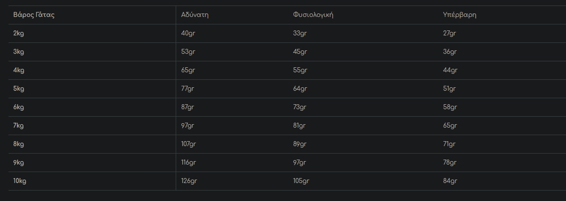 Κάθε γάτα είναι διαφορετική και η ποσότητα παρεχόμενης τροφής είναι πιθανό να αλλάζει με βάση την ηλικία και τον τρόπο ζωής της. Χρησιμοποιήστε την συνιστώμενη δόση σαν οδηγό, παρακολουθείστε το βάρος της και προσαρμόστε ανάλογα τις ποσότητες για τη μικρή μας φίλη. Ταΐστε την δύο φορές την ημέρα, έχοντας πάντα δίπλα της φρέσκο, καθαρό νερό!