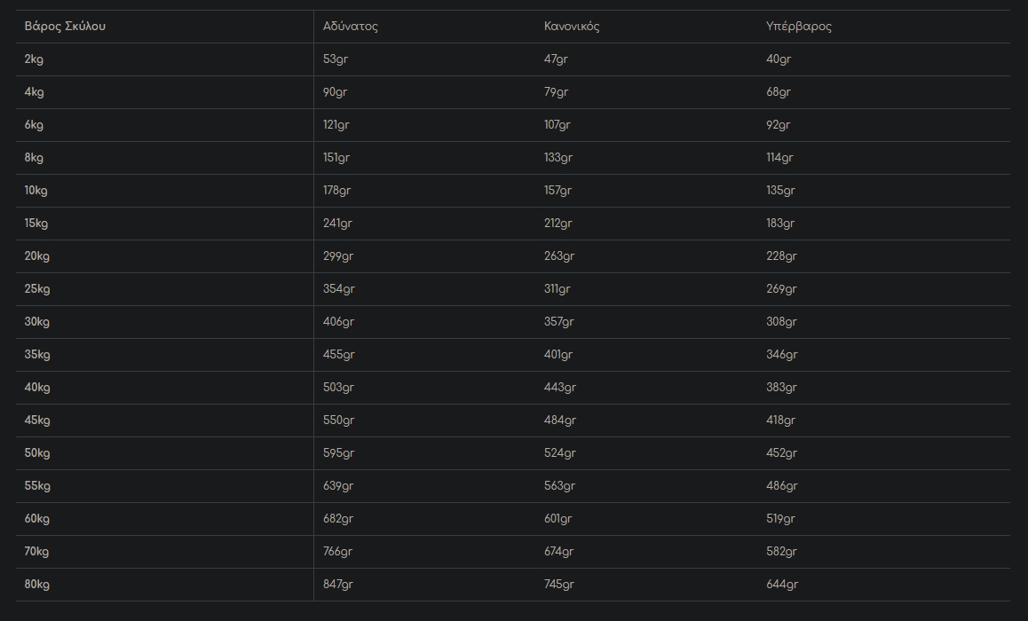 Κάθε σκύλος είναι διαφορετικός και η ποσότητα παρεχόμενης τροφής είναι πιθανό να αλλάζει με βάση την ηλικία και τον τρόπο ζωής του. Χρησιμοποιήστε την συνιστώμενη δόση σαν οδηγό, παρακολουθείστε το βάρος του και προσαρμόστε ανάλογα τις ποσότητες για τον μικρό μας φίλο. Ταΐστε τον δύο φορές την ημέρα, έχοντας πάντα δίπλα του φρέσκο, καθαρό νερό!