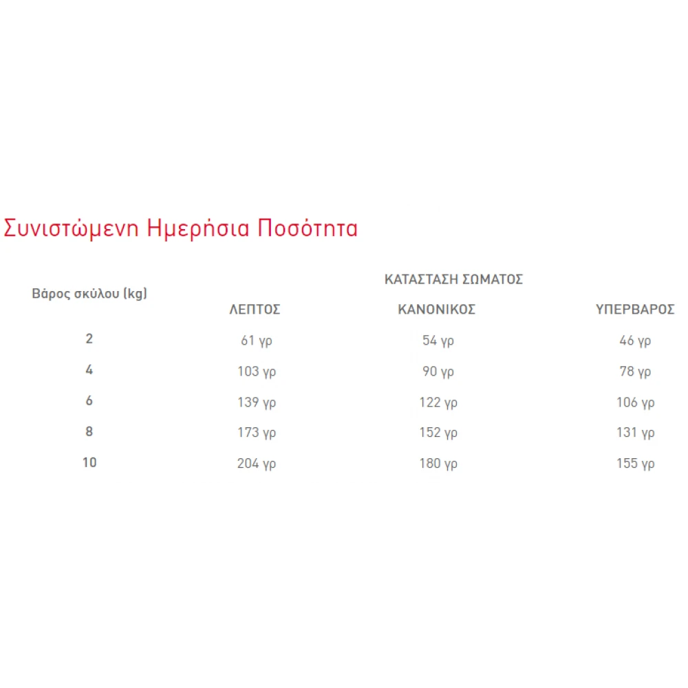 Κάθε σκύλος είναι διαφορετικός και η ποσότητα παρεχόμενης τροφής είναι πιθανό να αλλάζει με βάση την ηλικία και τον τρόπο ζωής του. Χρησιμοποιήστε την συνιστώμενη δόση σαν οδηγό, παρακολουθείστε το βάρος του και προσαρμόστε ανάλογα τις ποσότητες για τον μικρό μας φίλο. Ταΐστε τον δύο φορές την ημέρα, έχοντας πάντα δίπλα του φρέσκο, καθαρό νερό!