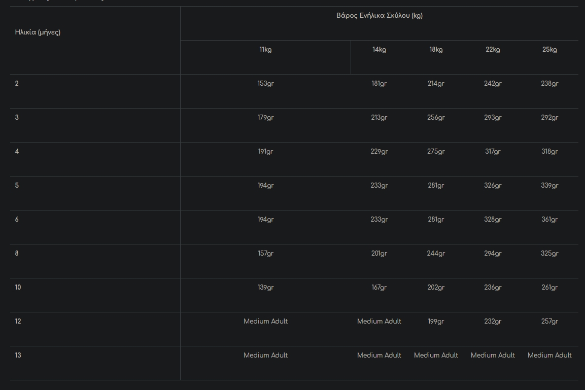- Βέλτιστο ενεργειακό περιεχόμενο: ικανοποιεί τις μέτριες ενεργειακές ανάγκες κουταβιών μεσαίων φυλών για μια μακρά περίοδο ανάπτυξης, ηλικίας έως 12 μηνών.
