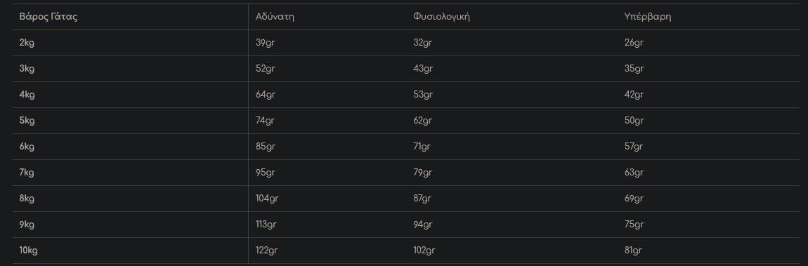 Κάθε γάτα είναι διαφορετική και η ποσότητα παρεχόμενης τροφής είναι πιθανό να αλλάζει με βάση την ηλικία και τον τρόπο ζωής της. Χρησιμοποιήστε την συνιστώμενη δόση σαν οδηγό, παρακολουθείστε το βάρος της και προσαρμόστε ανάλογα τις ποσότητες για τη μικρή μας φίλη. Ταΐστε την δύο φορές την ημέρα, έχοντας πάντα δίπλα της φρέσκο, καθαρό νερό!