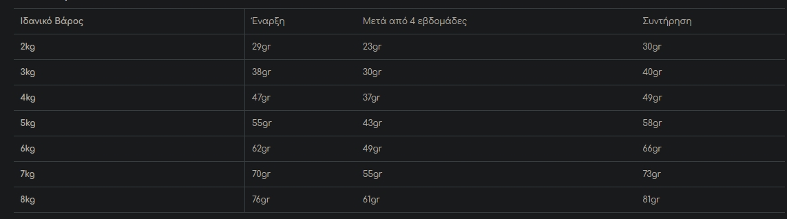 Κάθε γάτα είναι διαφορετική και η ποσότητα παρεχόμενης τροφής είναι πιθανό να αλλάζει με βάση την ηλικία και τον τρόπο ζωής της. Χρησιμοποιήστε την συνιστώμενη δόση σαν οδηγό, παρακολουθείστε το βάρος της και προσαρμόστε ανάλογα τις ποσότητες για τη μικρή μας φίλη. Ταΐστε την δύο φορές την ημέρα, έχοντας πάντα δίπλα της φρέσκο, καθαρό νερό!