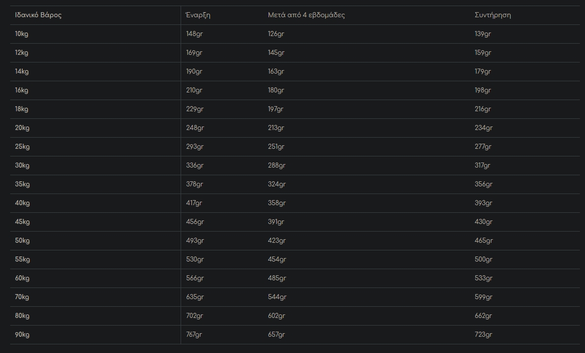 Κάθε σκύλος είναι διαφορετικός και η ποσότητα παρεχόμενης τροφής είναι πιθανό να αλλάζει με βάση την ηλικία και τον τρόπο ζωής του. Χρησιμοποιήστε την συνιστώμενη δόση σαν οδηγό, παρακολουθείστε το βάρος του και προσαρμόστε ανάλογα τις ποσότητες για τον μικρό μας φίλο. Ταΐστε τον δύο φορές την ημέρα, έχοντας πάντα δίπλα του φρέσκο, καθαρό νερό!