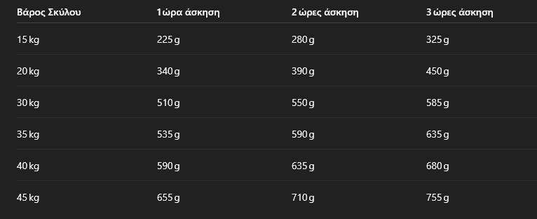 Δίνετε σύμφωνα με πίνακα σίτισης ανά ώρα άσκησης & βάρος. Πάντα με φρέσκο νερό. Η αλλαγή τροφής γίνεται σταδιακά σε 7 ημέρες.