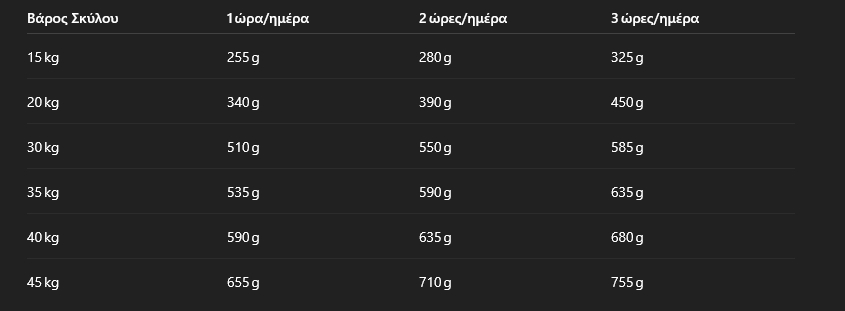 Κάθε σκύλος είναι διαφορετικός και η ποσότητα παρεχόμενης τροφής είναι πιθανό να αλλάζει με βάση την ηλικία και τον τρόπο ζωής του. Χρησιμοποιήστε την συνιστώμενη δόση σαν οδηγό, παρακολουθείστε το βάρος του και προσαρμόστε ανάλογα τις ποσότητες για τον μικρό μας φίλο. Ταΐστε τον δύο φορές την ημέρα, έχοντας πάντα δίπλα του φρέσκο, καθαρό νερό!