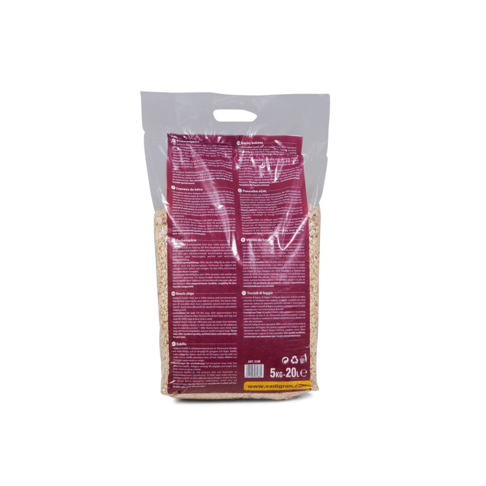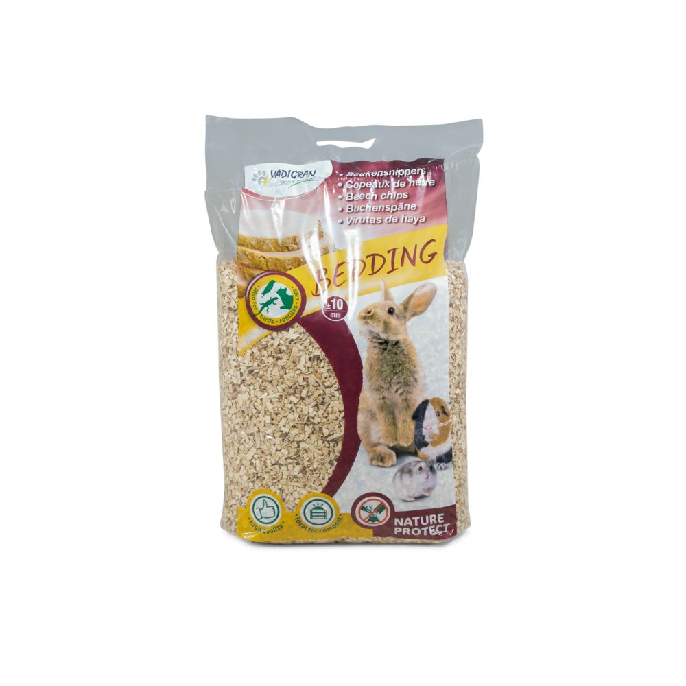 Το Vadigran Bedding Beech Chips είναι ένα υπόστρωμα από ξυλοτεμαχίδια οξιάς με μεγαλύτερο μέγεθος κόκκων 10 mm, σχεδιασμένο για χρήση σε κλουβιά και χώρους διαμονής μικρών ζώων όπως κουνέλια, ινδικά χοιρίδια και χάμστερ, προσφέροντας καλή απορρόφηση υγρασίας και φυσική άνεση.