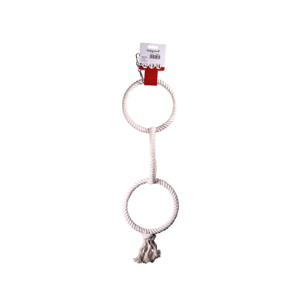 Τριπλό παιχνίδι για πτηνά με τρία δαχτυλίδια από βαμβάκι σε μήκη 48 cm και 14 cm, σχεδιασμένο να ενισχύει τη φυσική δραστηριότητα και την ψυχαγωγία εντός του κλουβιού. Προσφέρει πολλαπλές επιλογές για πιάσιμο, ισορροπία και κινητική αλληλεπίδραση, υποστηρίζοντας την εξερεύνηση και την ενεργητικότητα των πτηνών.