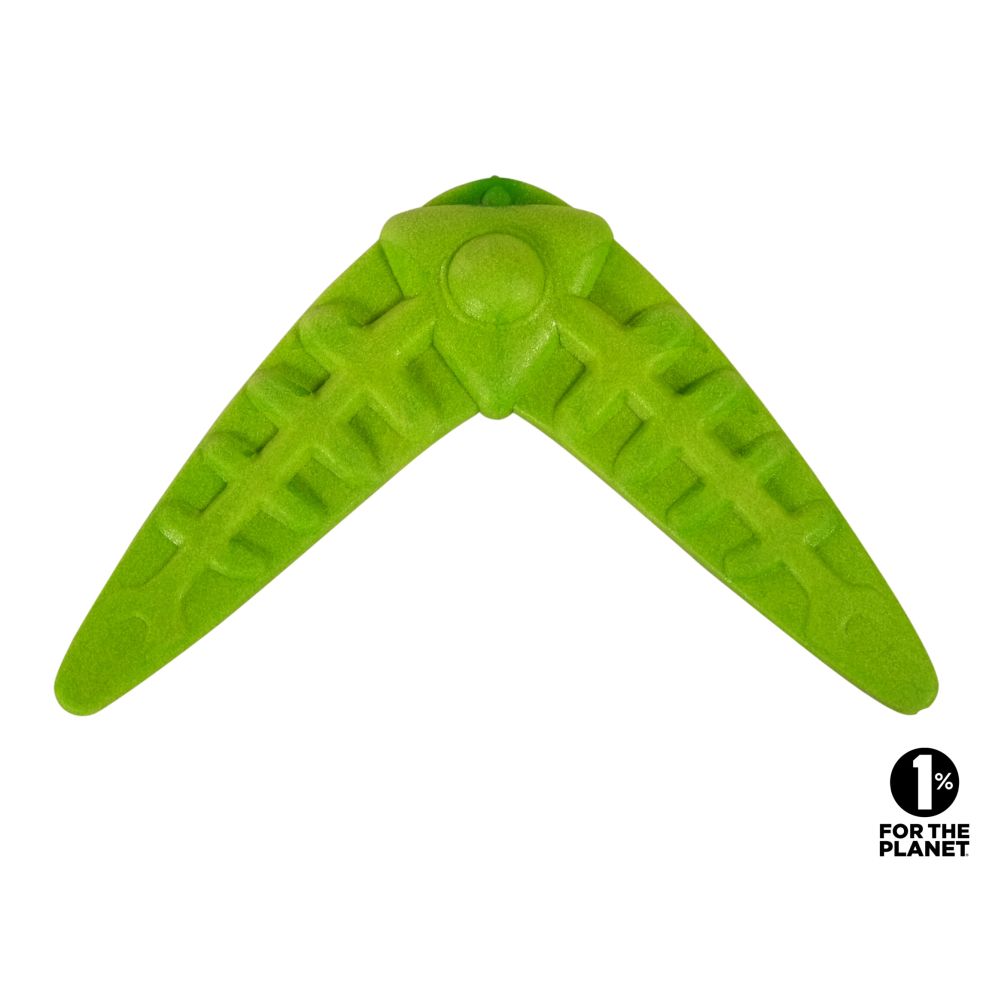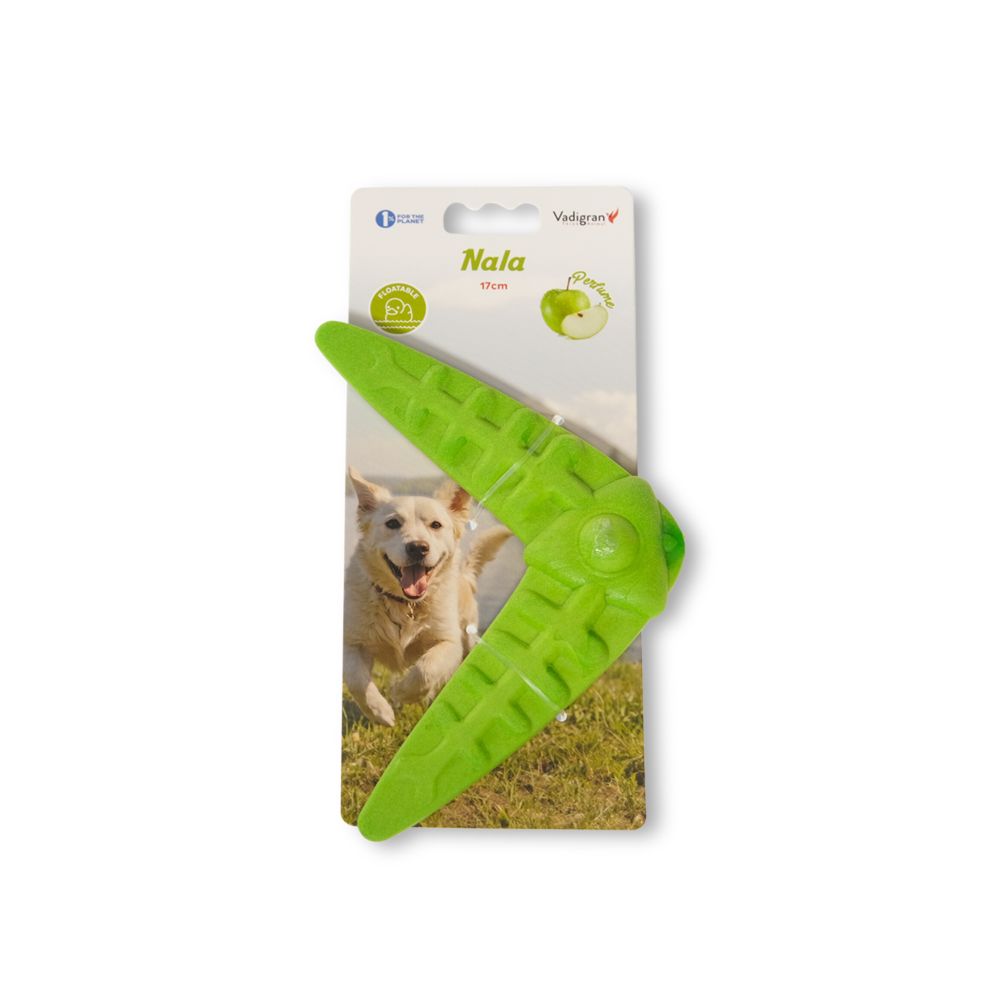 Το Vadigran Παιχνίδι Καουτσούκ TPR Boomerang Πράσινο 17cm 140gr είναι κατασκευασμένο από θερμοπλαστικό καουτσούκ (TPR) υψηλής αντοχής, σχεδιασμένο για ενεργητικό παιχνίδι εξωτερικού χώρου. Το φωτεινό πράσινο χρώμα το καθιστά εύκολα ορατό, ενώ το μήκος 17cm του boomerang το καθιστά κατάλληλο για σκύλους που απολαμβάνουν ρίψεις και ανάκτηση.