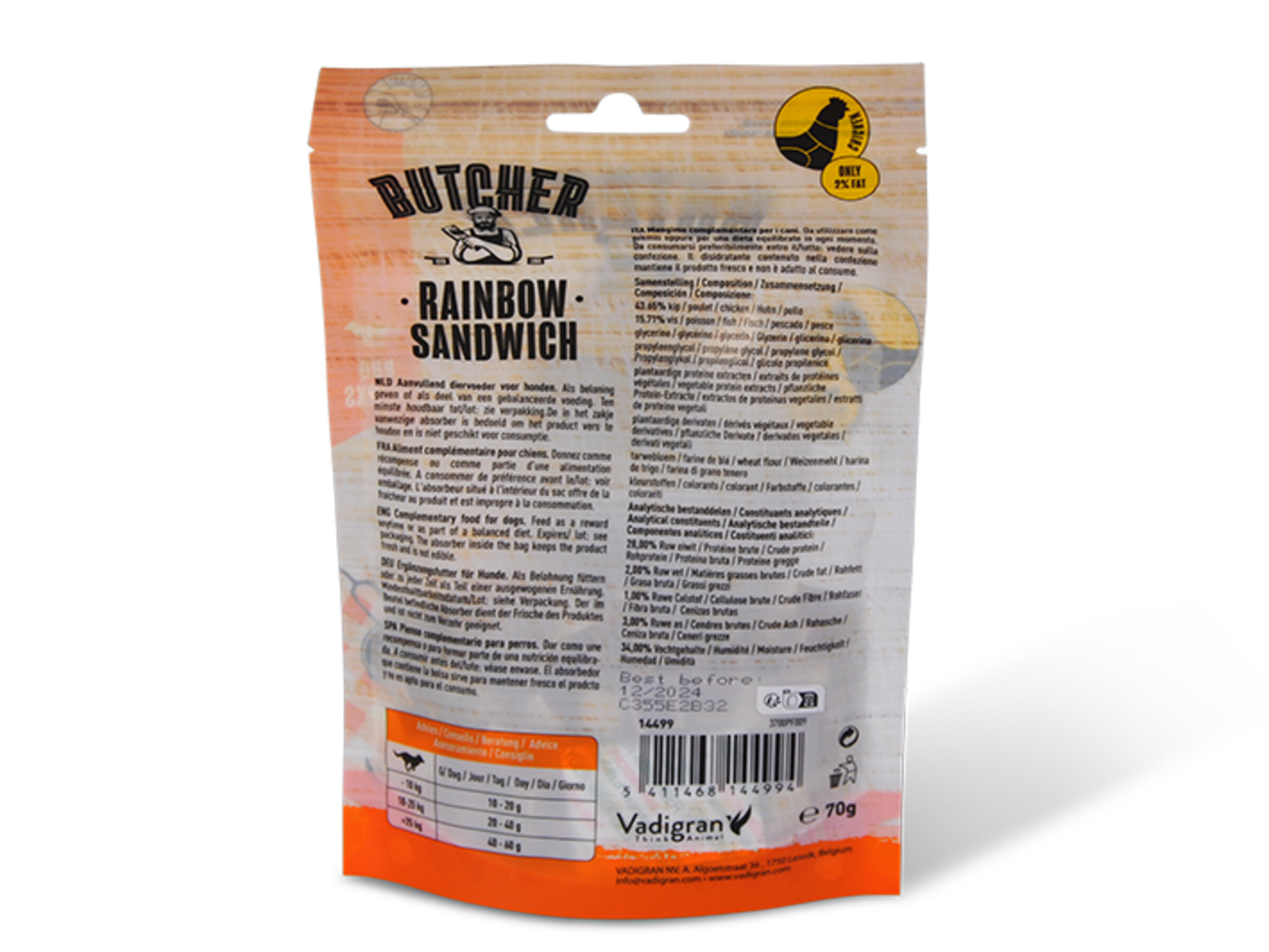 - Με κοτόπουλο (43,65 %) και ψάρι (15,71 %) σε κομψή μορφή σάντουιτς – ιδανική για μικρές και μεγάλες φυλές.