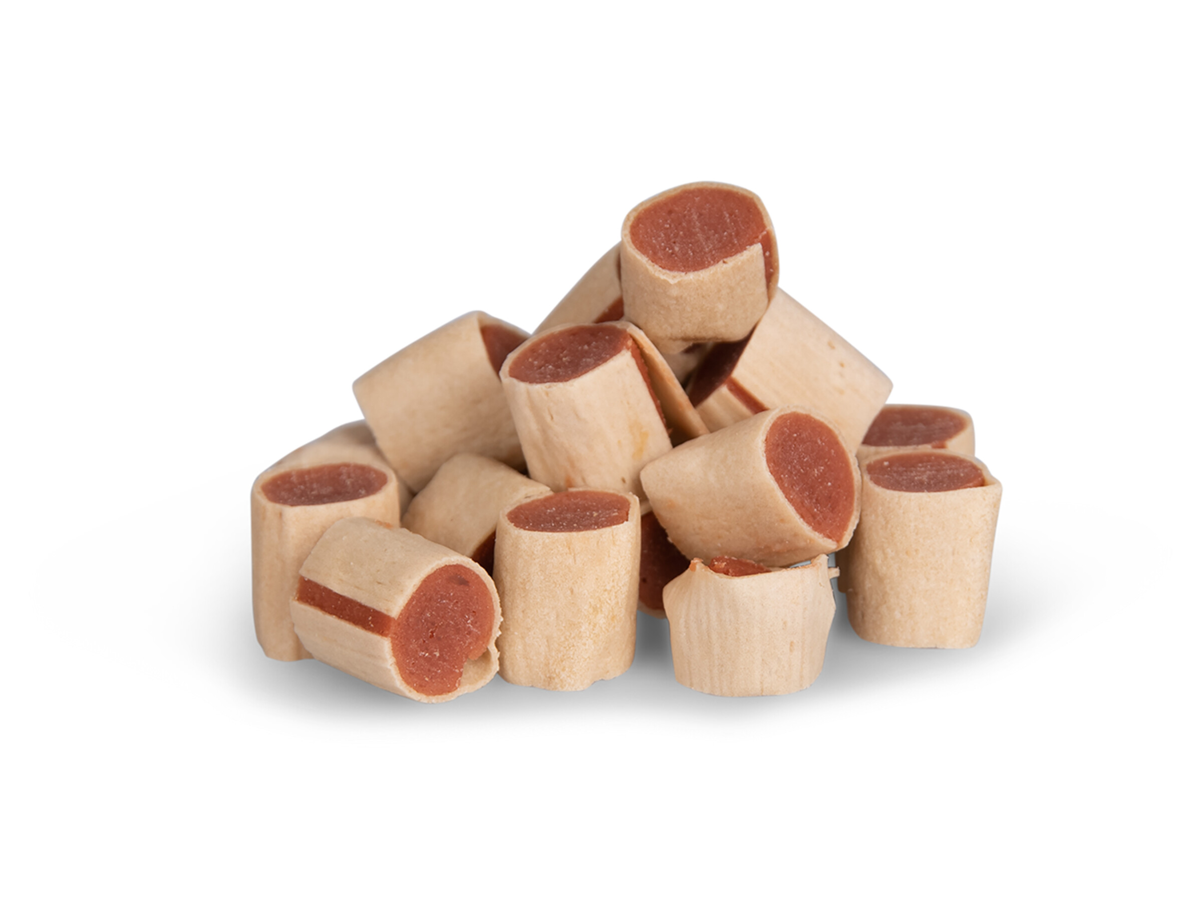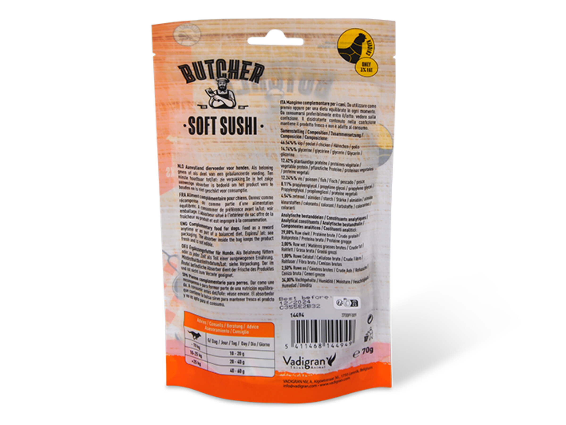 - Μαλακή λιχουδιά με 46,54 % κοτόπουλο και 12,24 % ψάρι, ιδανική για μικρές και μεγάλες φυλές.
