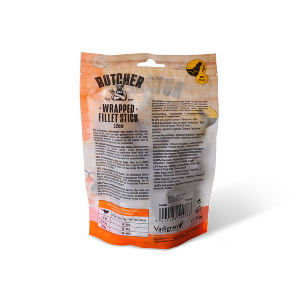 Το Vadigran Butcher BBQ Chicken Wrapped Fillet Stick είναι μια νόστιμη και τρυφερή λιχουδιά για σκύλους, με φιλέτο κοτόπουλου τυλιγμένο γύρω από ένα stick. Η συνδυαστική γεύση και η μαλακή υφή το καθιστούν ιδανική επιλογή για επιβράβευση, εκπαίδευση ή απλή απόλαυση μετά από παιχνίδι ή βόλτα.