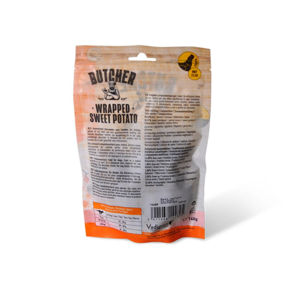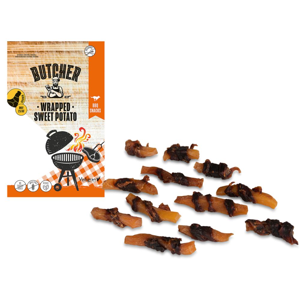 Το Vadigran Butcher BBQ Chicken Wrapped Sweet Potato είναι μια γευστική λιχουδιά για σκύλους, με τρυφερά κομμάτια κοτόπουλου τυλιγμένα σε φυσική γλυκοπατάτα. Ο συνδυασμός αυτός προσφέρει πλούσια γεύση και φυσική ενέργεια, καθιστώντας το ιδανικό για επιβράβευση, εκπαίδευση ή σαν καθημερινή λιχουδιά μετά τη βόλτα.