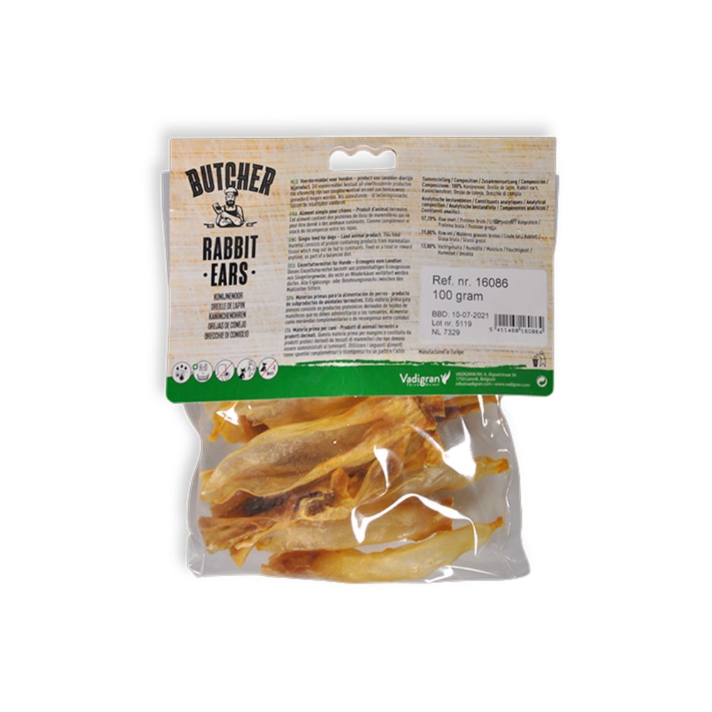 Η Vadigran Butcher Natural Αυτιά Κουνελιού Λιχουδιά Σκύλου 100 gr αποτελεί μια καθαρή μονοπρωτεϊνική επιλογή για σκύλους με ανάγκη για εύπεπτες λιχουδιές. Κατασκευάζεται από 100 % αυτιά κουνελιού, χωρίς πρόσθετα, χρωστικές, συντηρητικά ή ζάχαρη, και είναι χωρίς γλουτένη. Με υψηλή περιεκτικότητα σε πρωτεΐνη (~57,2 %) και λίπος (~19 %), σε συνδυασμό με υγρασία ~13 %, υποστηρίζει τη φυσική μάσηση και την υγιεινή των δοντιών και των ούλων.