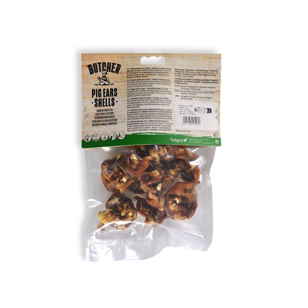 Η Vadigran Butcher Natural Δέρμα Χοιρινού (Pig Ears Shells) Λιχουδιά Σκύλου 150gr αποτελεί μια μονοπρωτεϊνική επιλογή για σκύλους που απολαμβάνουν το μάσημα. Κατασκευάζεται αποκλειστικά από δέρμα χοιρινού (pig ears shells), χωρίς πρόσθετα, χρωστικές, συντηρητικά ή ζάχαρη, και είναι χωρίς γλουτένη. Η τραγανή υφή προσφέρει διέγερση του φυσικού ενστίκτου του σκύλου, συμβάλλοντας παράλληλα στην επίδραση καθαρισμού των δοντιών.