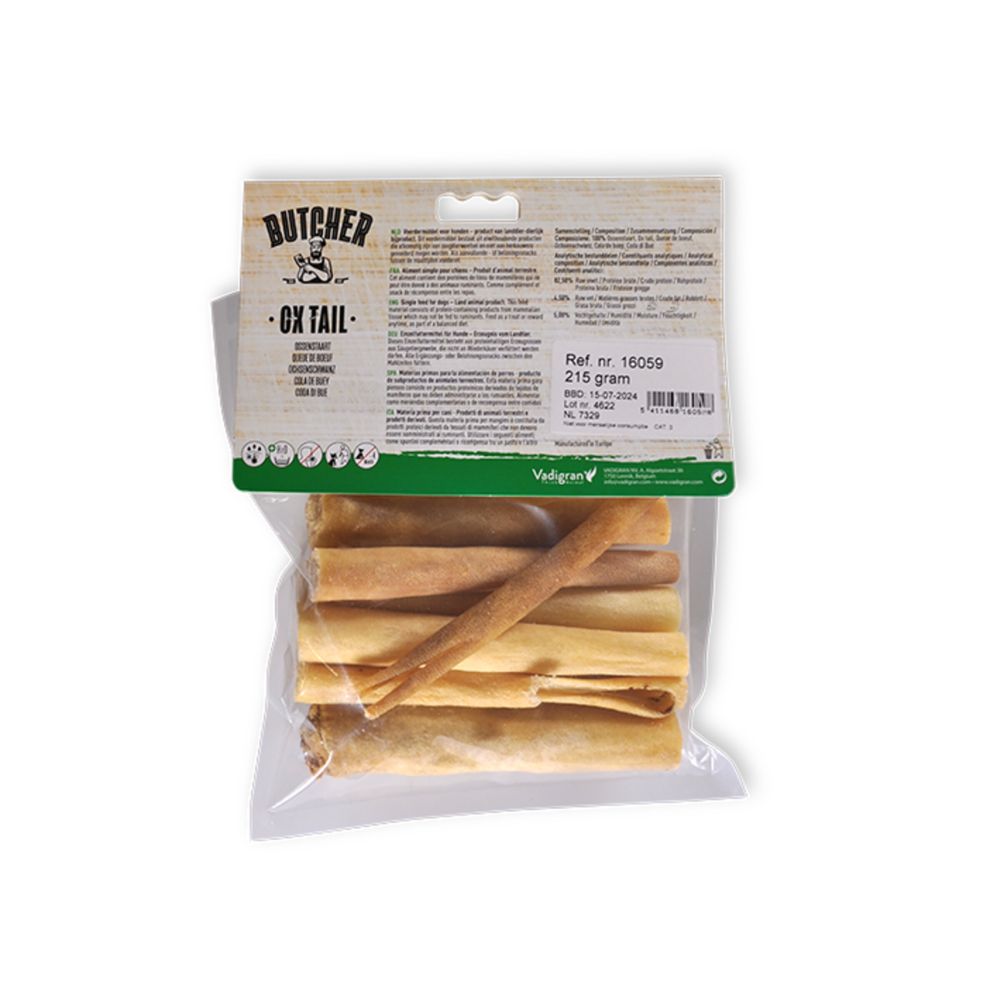 Η Vadigran Butcher Natural Ουρά Βοδινού Λιχουδιά Σκύλου 215 gr αποτελεί μια ποιοτική και μονοπρωτεϊνική επιλογή για τον σκύλο σας που απολαμβάνει το μάσημα. Κατασκευάζεται από 100% ουρά βοδινού, χωρίς πρόσθετα, χρωστικές ή συντηρητικά, και είναι κατάλληλη για σκύλους με ανάγκη φυσικής απασχόλησης. Η υφή της υποστηρίζει την υγιεινή των δοντιών και των ούλων μέσα από το μάσημα.
