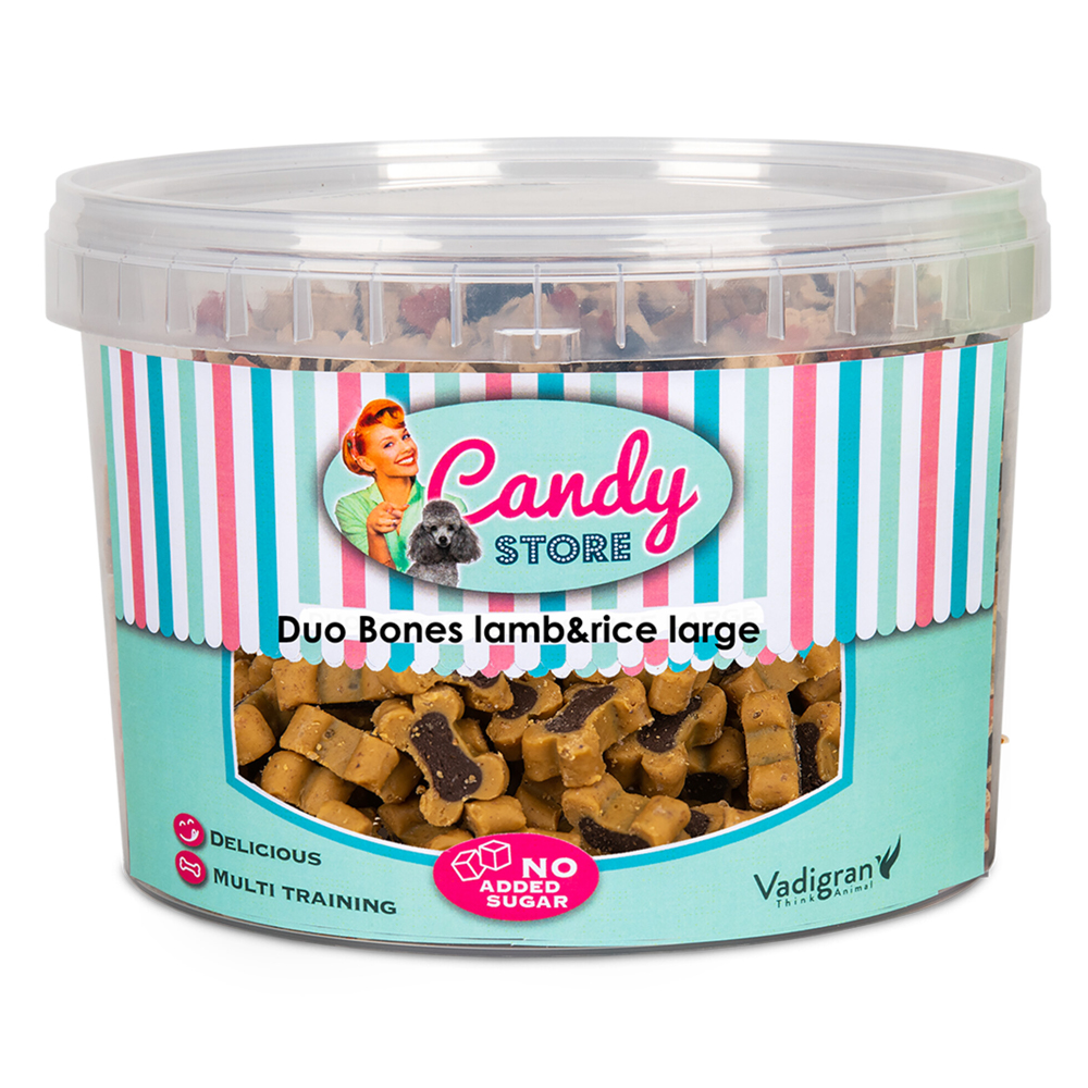 Οι Vadigran Candy Duo Bones Lamb Rice Large είναι μαλακές λιχουδιές σχήματος κόκκαλου, σχεδιασμένες για καθημερινή χρήση: