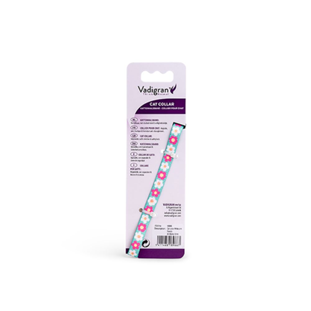 Το Vadigran Cat Collar White-Pink Flowers Κολάρο Γάτας 20-30cm×10mm είναι ρυθμιζόμενο nylon κολάρο με λευκό-ροζ σχέδιο λουλουδιών, ιδανικό για γάτες μικρού έως μεσαίου μεγέθους.